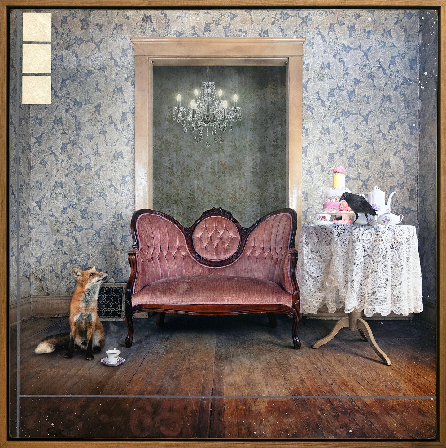 In "A Voice So Sweet," part of Morgan Jones's Animals Series, a curious red fox sits by a teacup on a weathered wooden floor, looking across the room at a crow exploring a table draped in vintage lace, set for afternoon tea. The scene is set against the backdrop of a room adorned with vintage floral wallpaper and an antique chez lounge.
