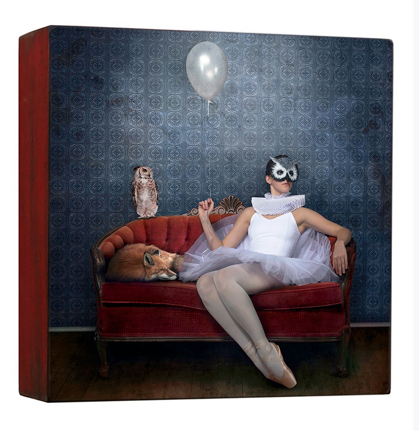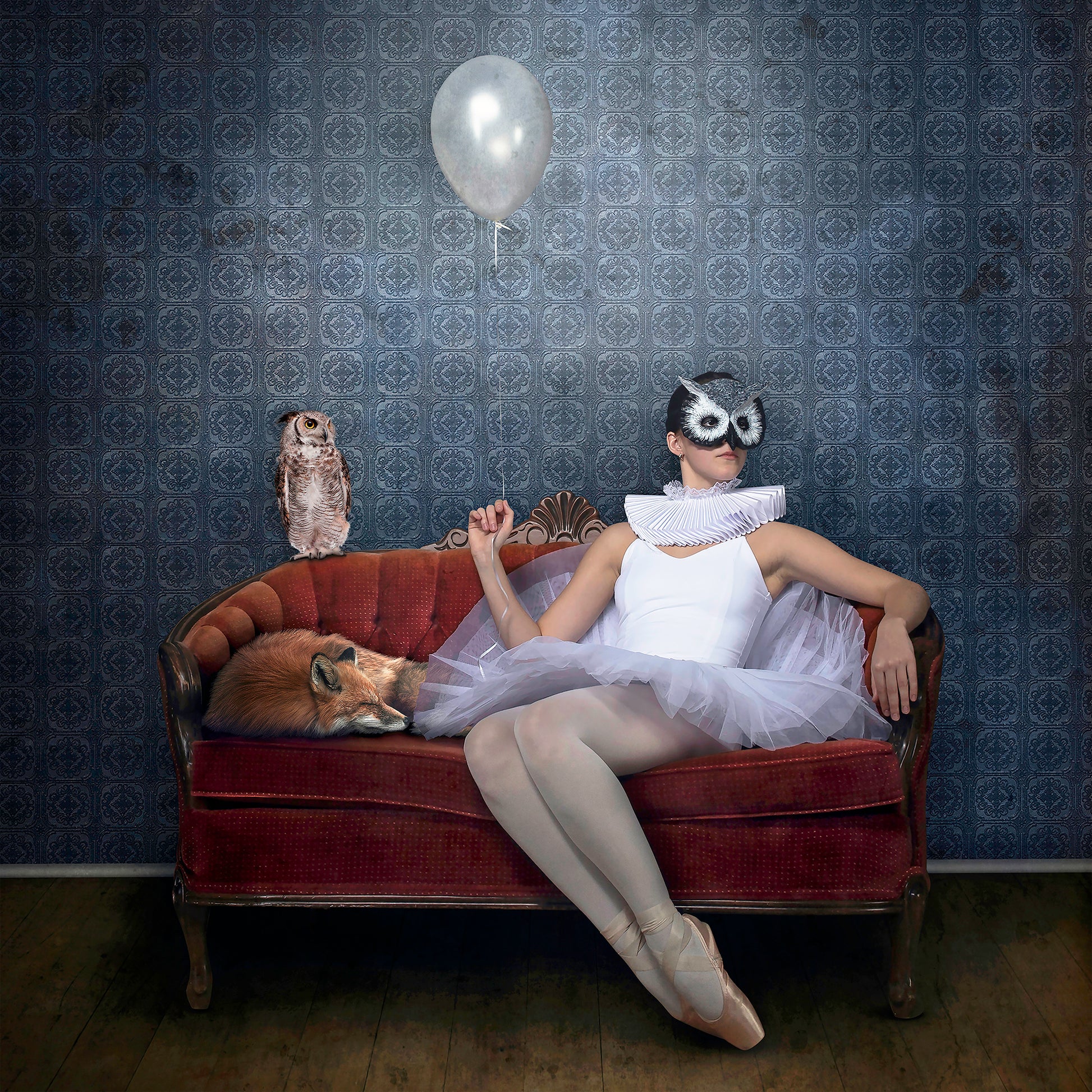 "Birds of a Feather" from the Masked Series shows a ballerina in a white tutu and a mask sitting on a red sofa. A fox lies beside her, and an owl is perched nearby. They are in a room with patterned wallpaper and a floating balloon.