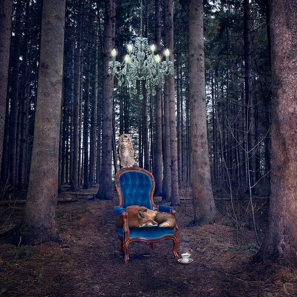 "Bonne Nuit" from the Animals Series by Morgan Jones features a tranquil forest scene at dusk with a sleeping fox on a vintage blue upholstered chair while an owl perches on the chair's back. An elegant chandelier hangs above, blending the natural world with a hint of domestic comfort.
