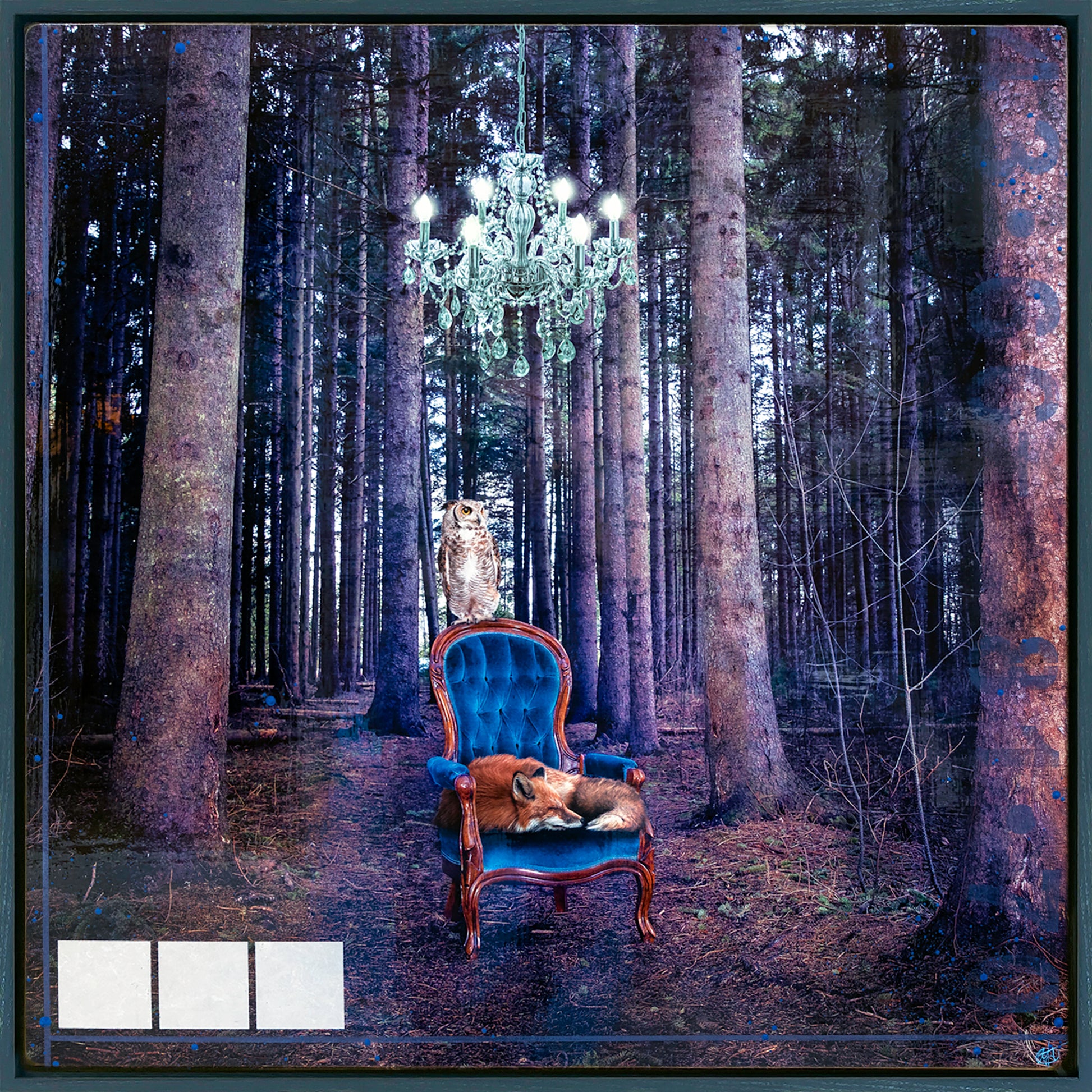 "Bonne Nuit" from the Animals Series by Morgan Jones features a tranquil forest scene at dusk with a sleeping fox on a vintage blue upholstered chair while an owl perches on the chair's back. An elegant chandelier hangs above, blending the natural world with a hint of domestic comfort.