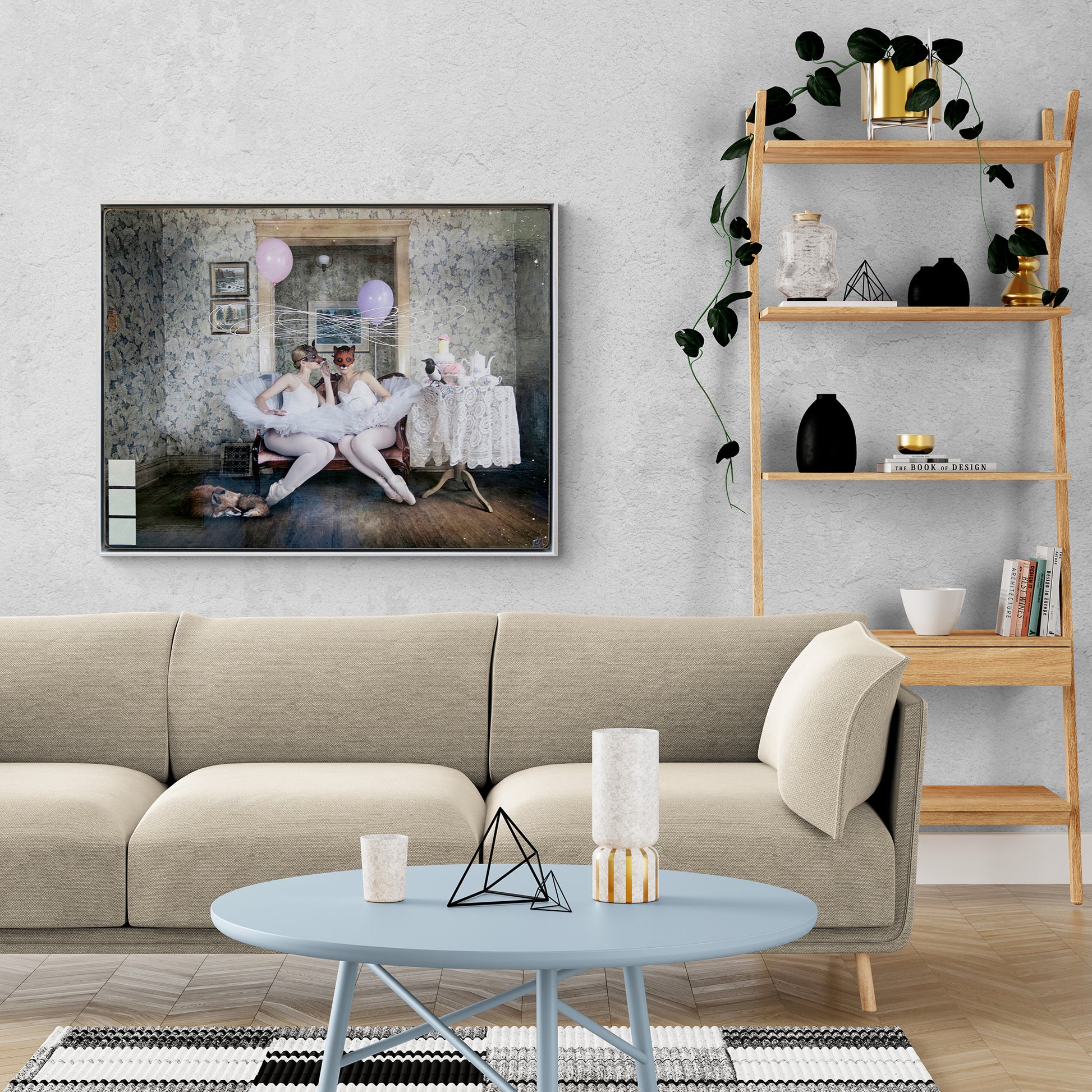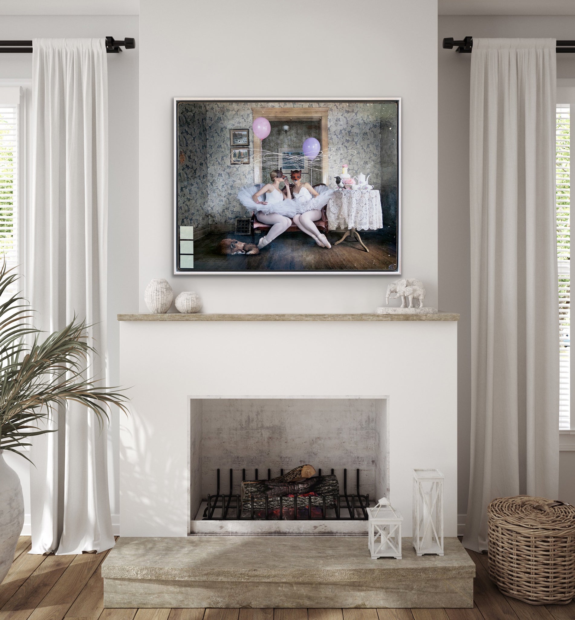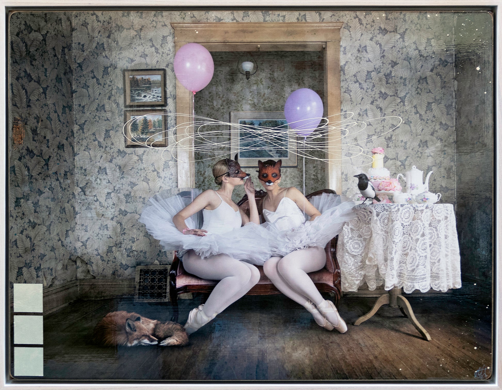 "But A Whisper" is part of the Masked Series by Morgan Jones, featuring two ballerinas wearing fox masks sitting on an antique sofa. A sleeping fox lies at their feet, and a magpie is perched on a nearby table adorned with afternoon tea. Above the figures, swirls intersect, with balloons held by each ballerina floating just out of reach.