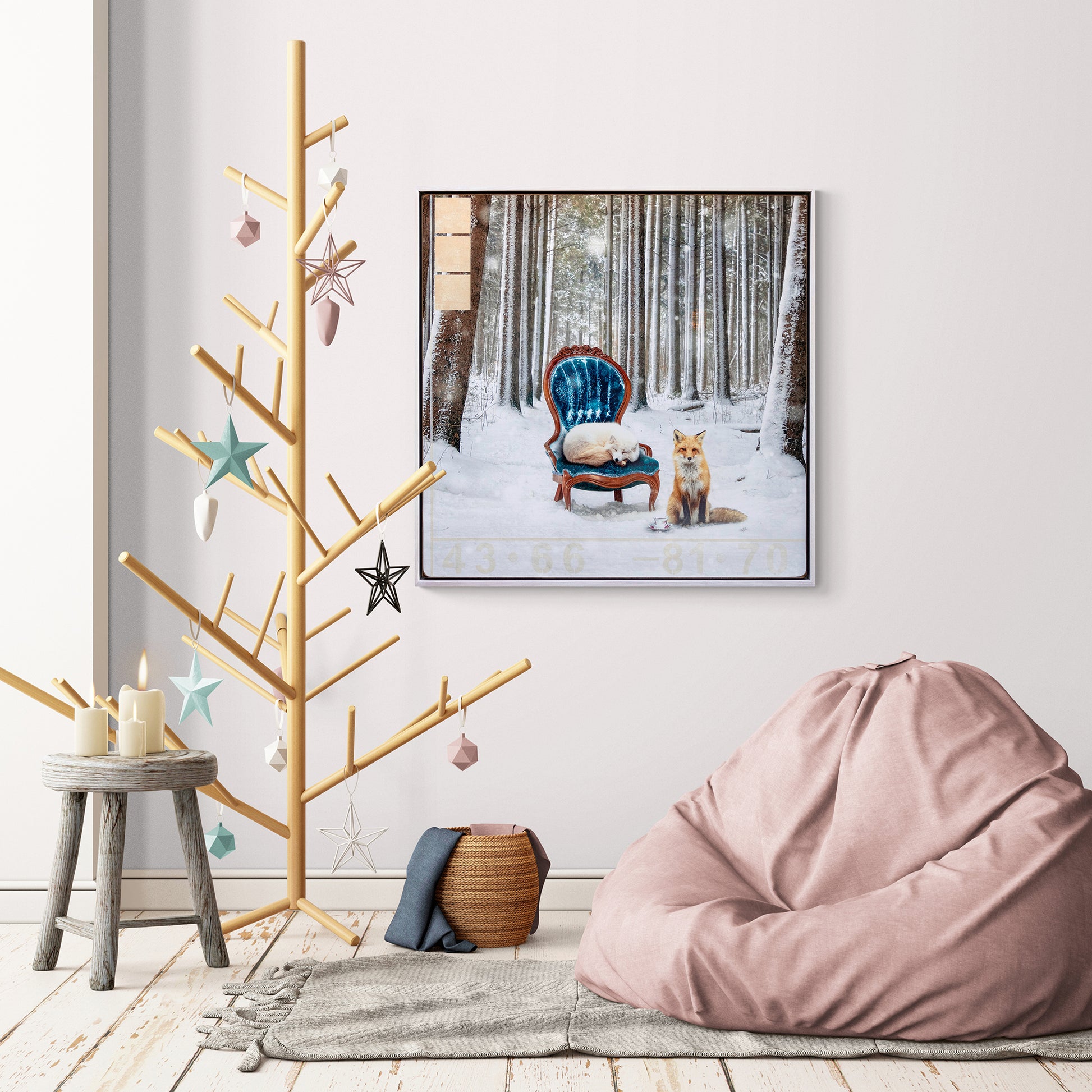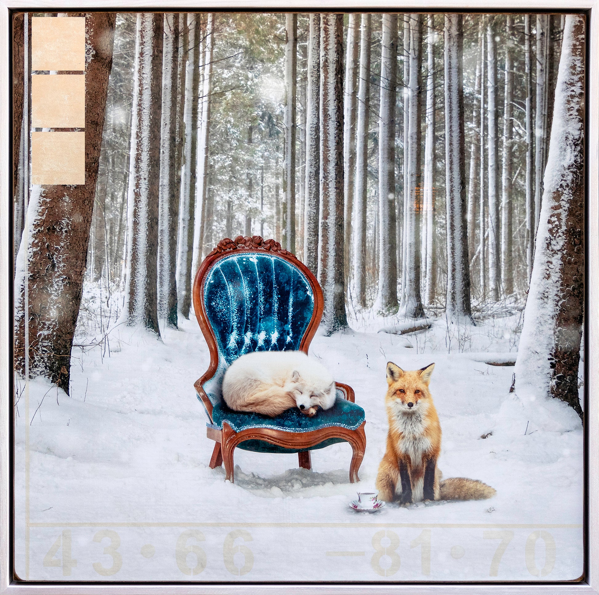 In "By Your Side," part of the Animals Series by Morgan Jones, an Arctic fox lay sleeping on a vintage blue velvet chair amidst a snow-covered forest setting, with a red fox standing and keeping watch. The scene is peaceful, with fresh snow blanketing the ground and the trees, enhancing the stillness of the moment in this whimsical piece.