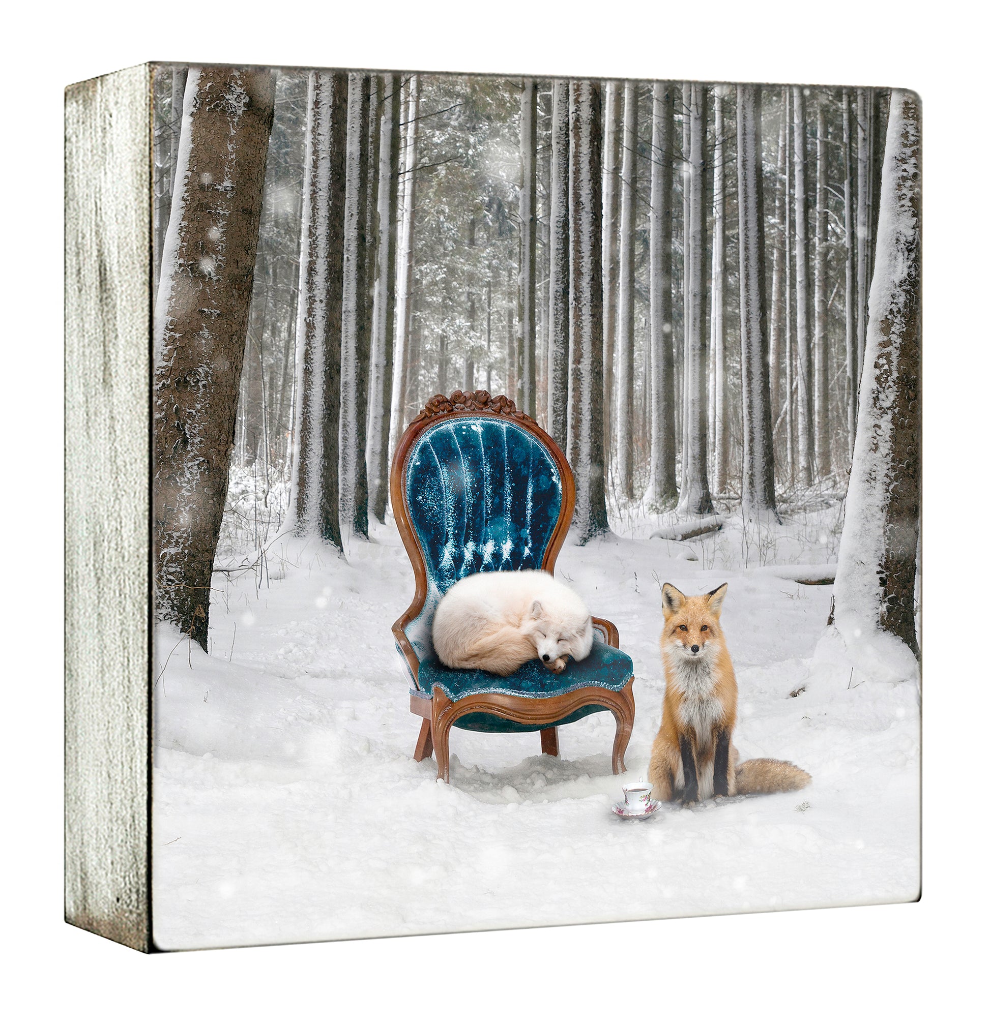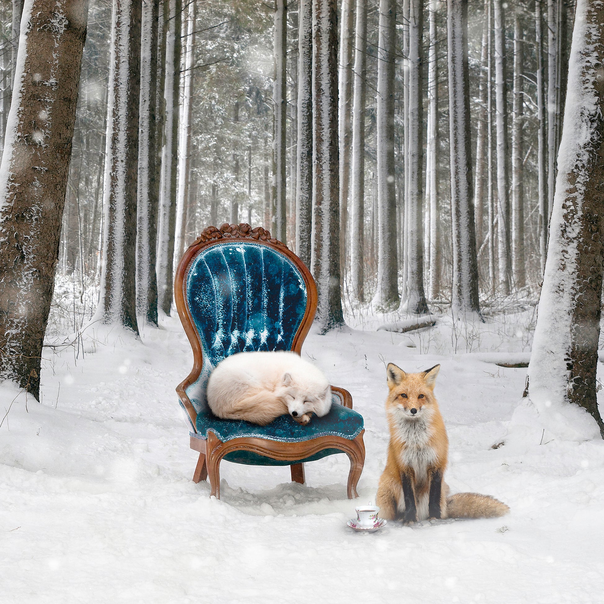 In "By Your Side," part of the Animals Series by Morgan Jones, an Arctic fox lay sleeping on a vintage blue velvet chair amidst a snow-covered forest setting, with a red fox standing and keeping watch. The scene is peaceful, with fresh snow blanketing the ground and the trees, enhancing the stillness of the moment in this whimsical piece.