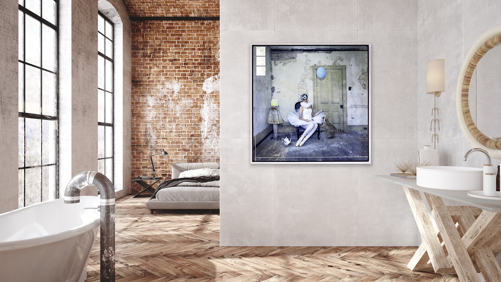 "Let Them Eat Cake" from the Masked Series by Morgan Jones depicts a ballerina in an owl mask seated, holding a teacup, with a raccoon at her side. The setting is an old, abandoned farmhouse with peeling wallpaper and a blue balloon held by the ballerina floating nearby, alongside a table with a cake, adding a touch of whimsy to the abandoned space.