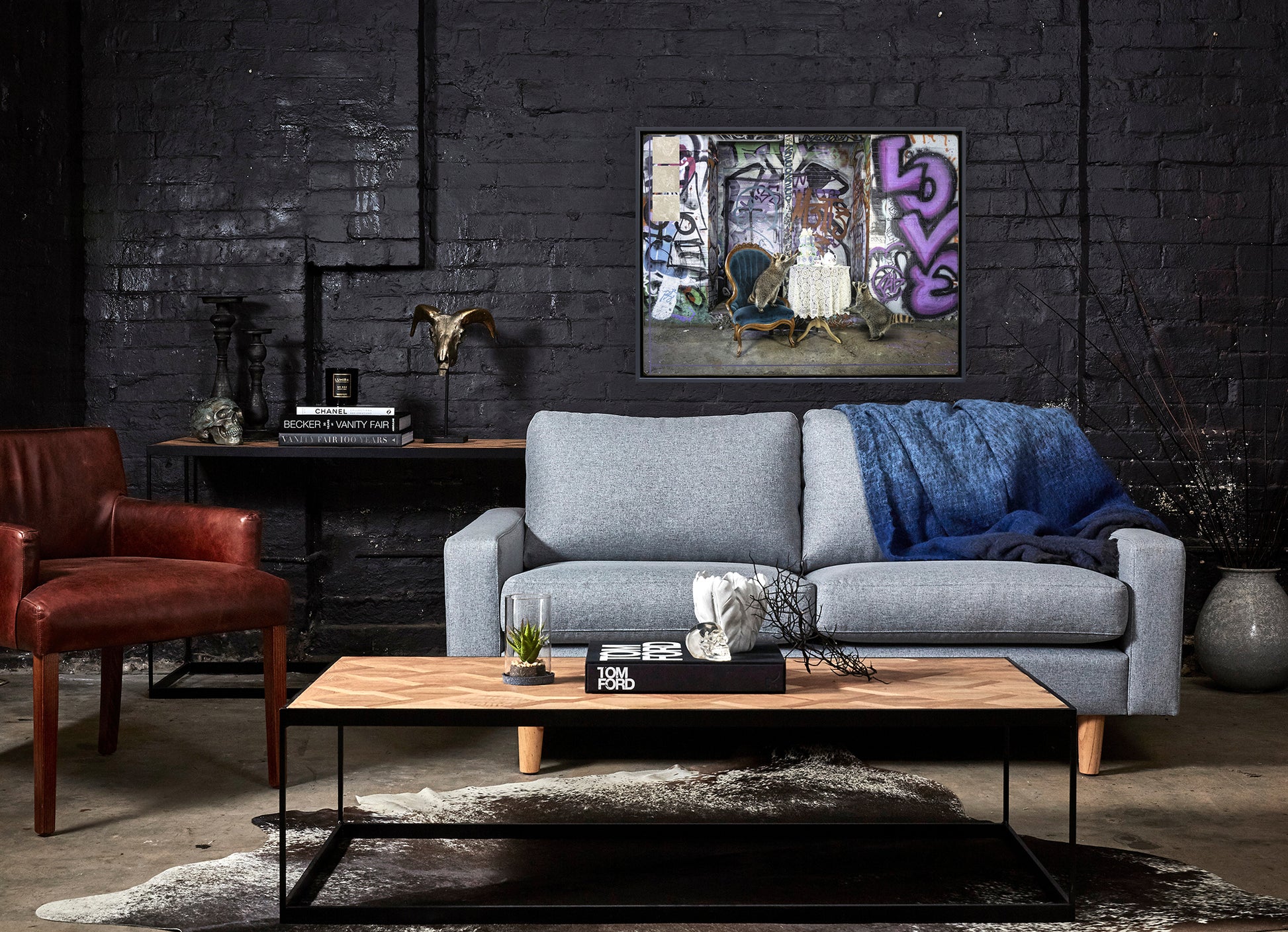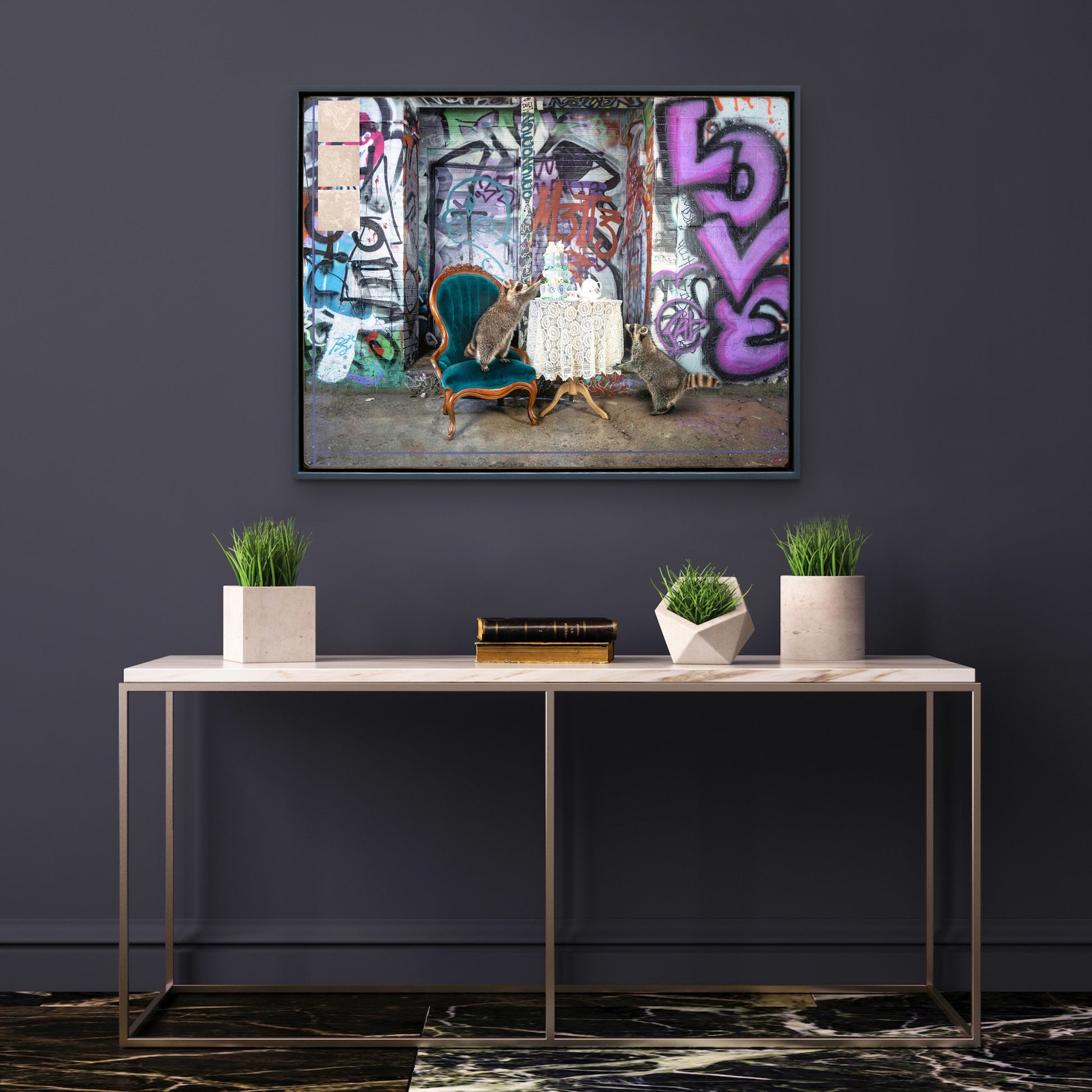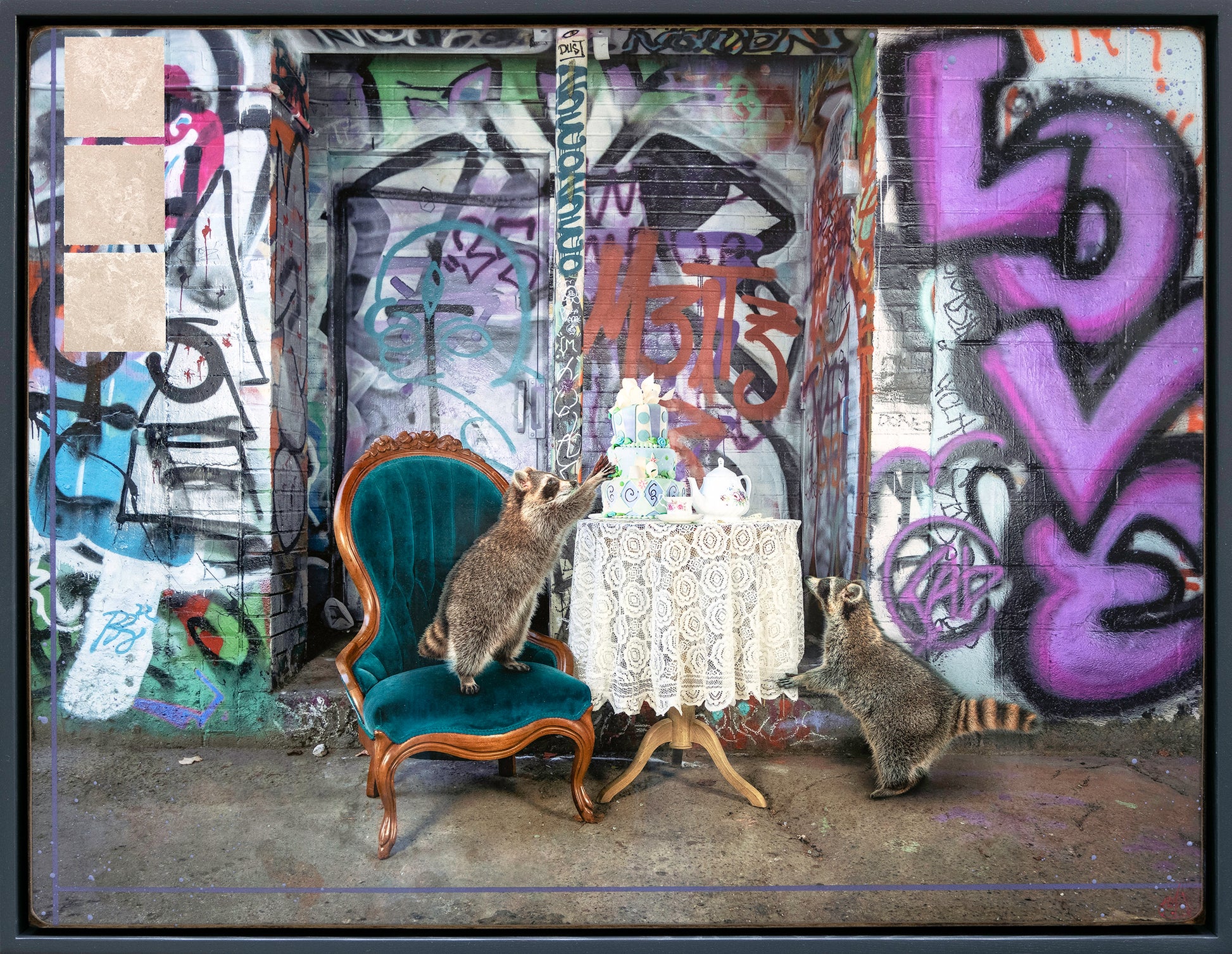"Party Crashers" from the Animals Series by Morgan Jones captures two raccoons amidst an urban backdrop tagged with vibrant graffiti. One raccoon stands on a vintage turquoise chair, peering at a lavish cake atop a lace-covered table set for afternoon tea, while its companion sits opposite, creating a playful contrast between wildlife and the city's artistic expression.