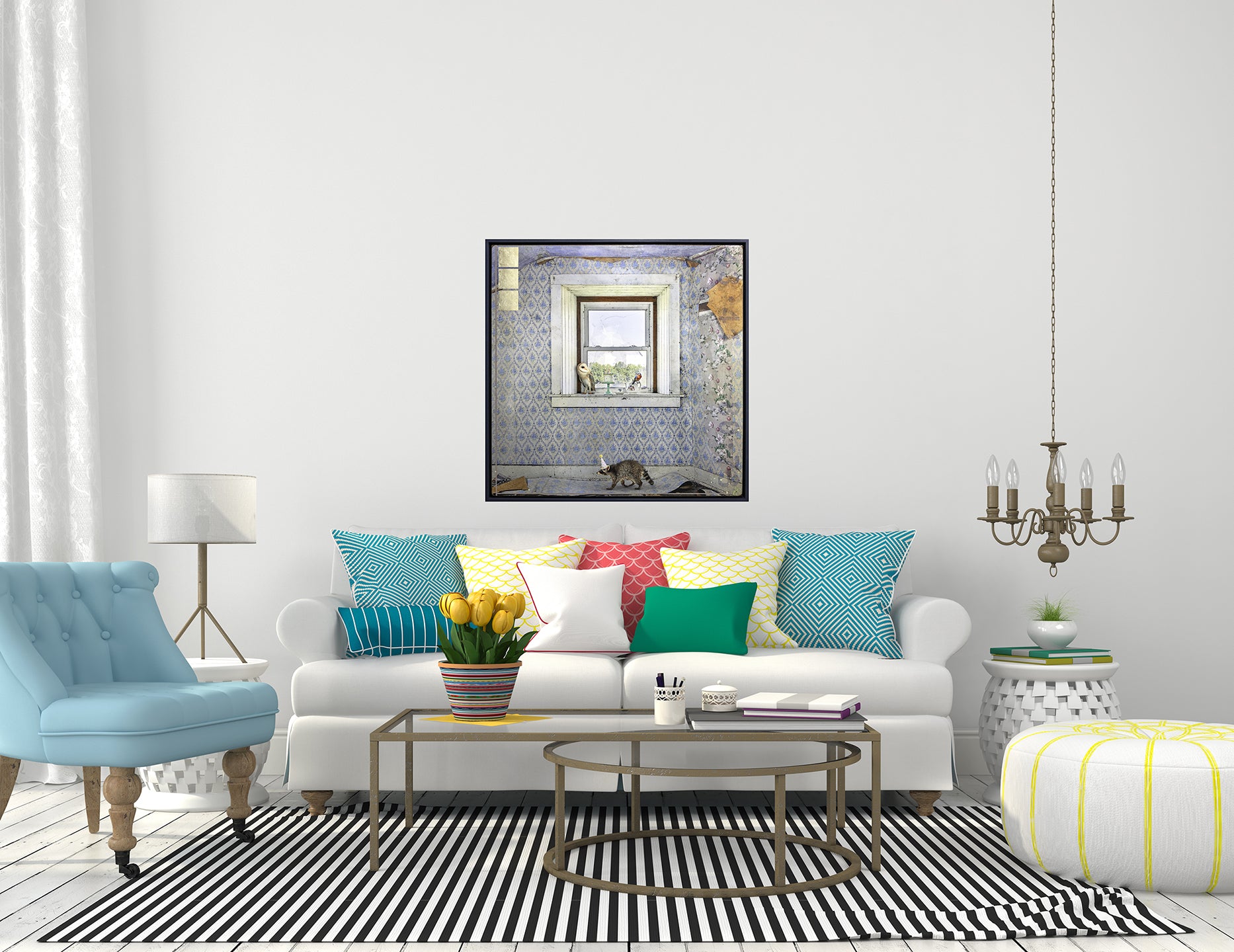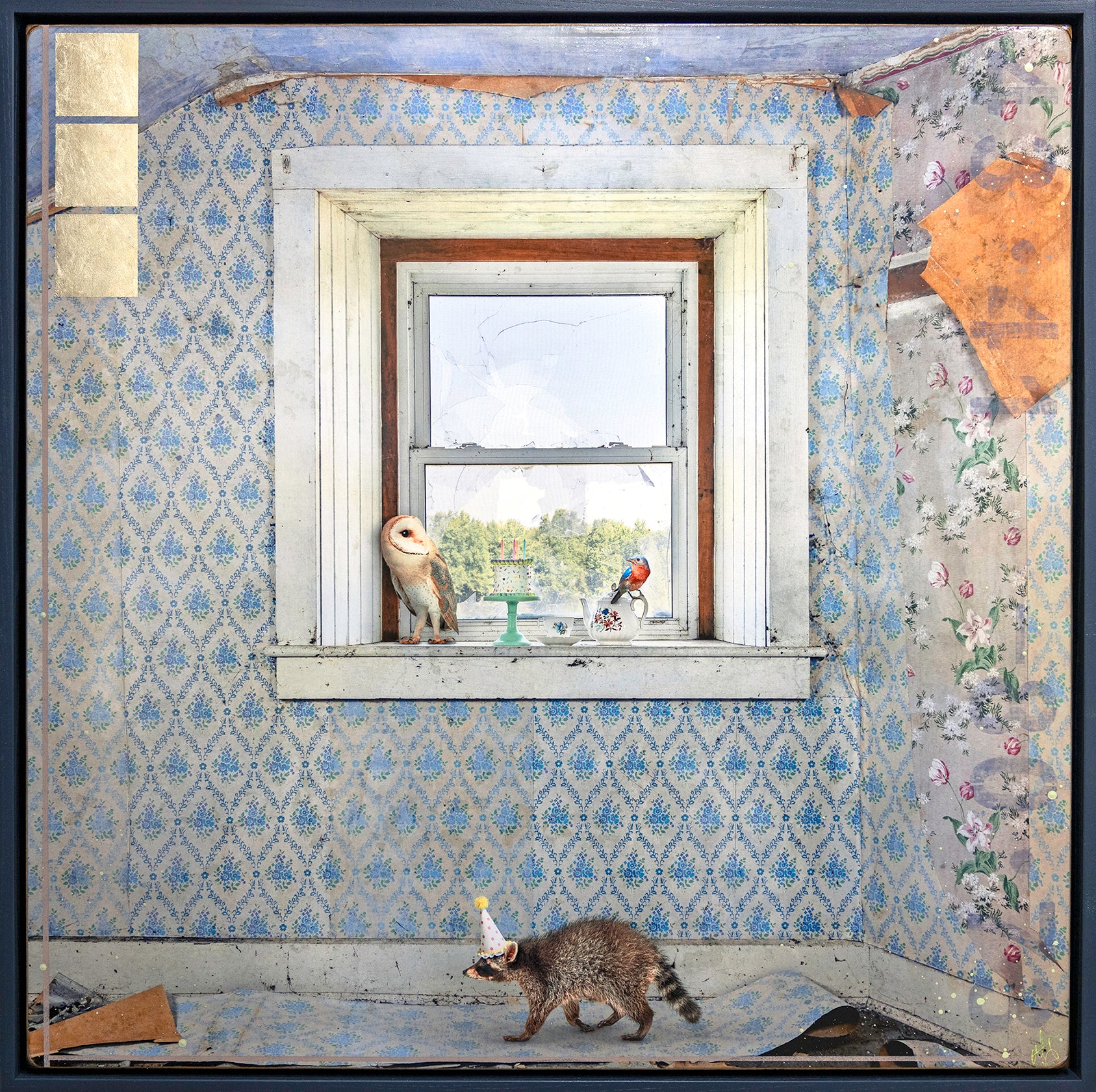 "Sneak Attack," from the Animals Series by Morgan Jones, depicts a raccoon sneaking along an old farmhouse floor, while an owl and a songbird partake in tea and cake on the window ledge above. Set against the backdrop of a room in an abandoned farmhouse with peeling wallpaper and a worn and weathered window, this image contrasts the raccoon's playfulness with the abandoned home's dilapidated setting.