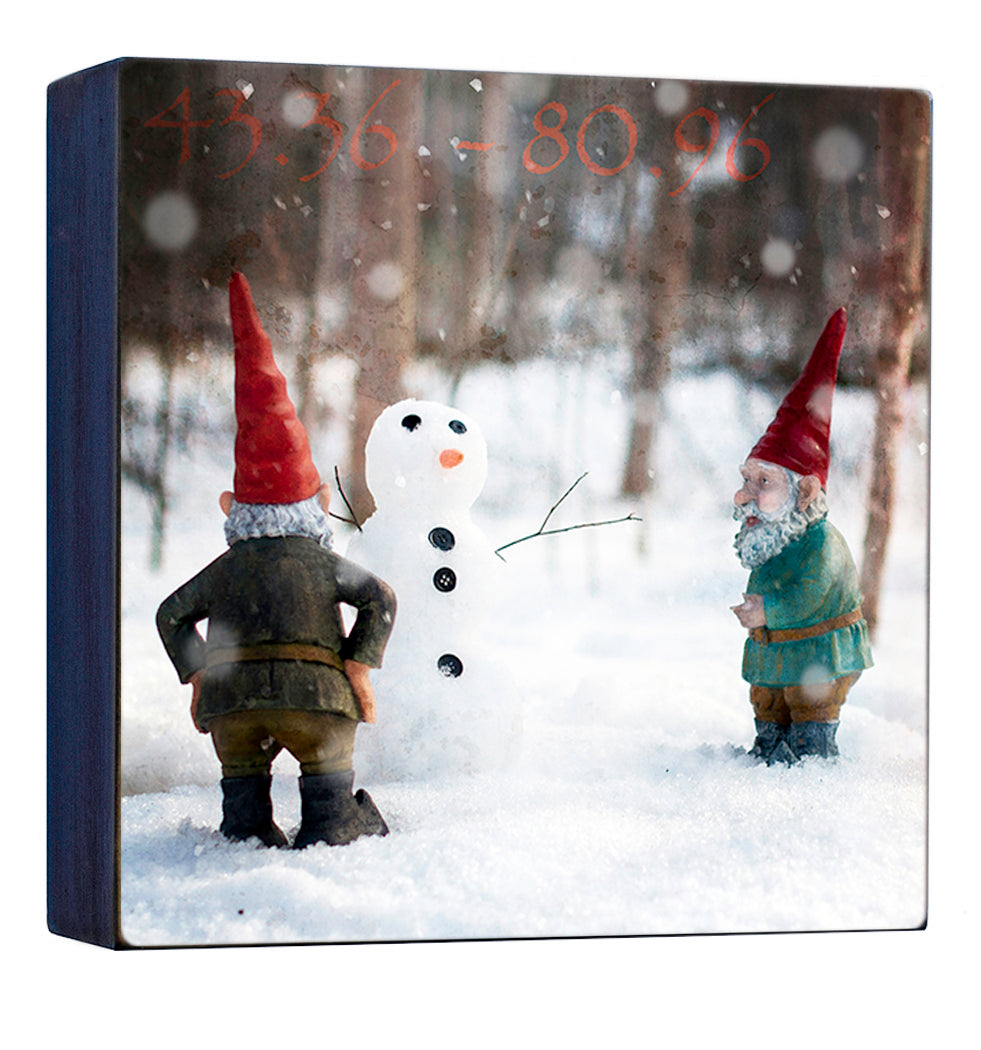"Snow Day" is a charming addition to the Wandering Gnomes Series. Two gnomes are seen engaging with a freshly built snowman amidst a serene winter forest.