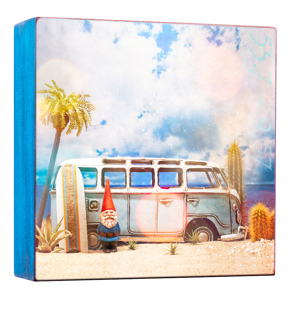 The image "Surf's Up" is from the Wandering Gnomes Series. It depicts a whimsical gnome with an iconic red hat standing beside a classic VW van and surfboard. Palm trees and cacti add a touch of the tropics, while the blue sky with soft clouds creates a relaxed beach atmosphere.