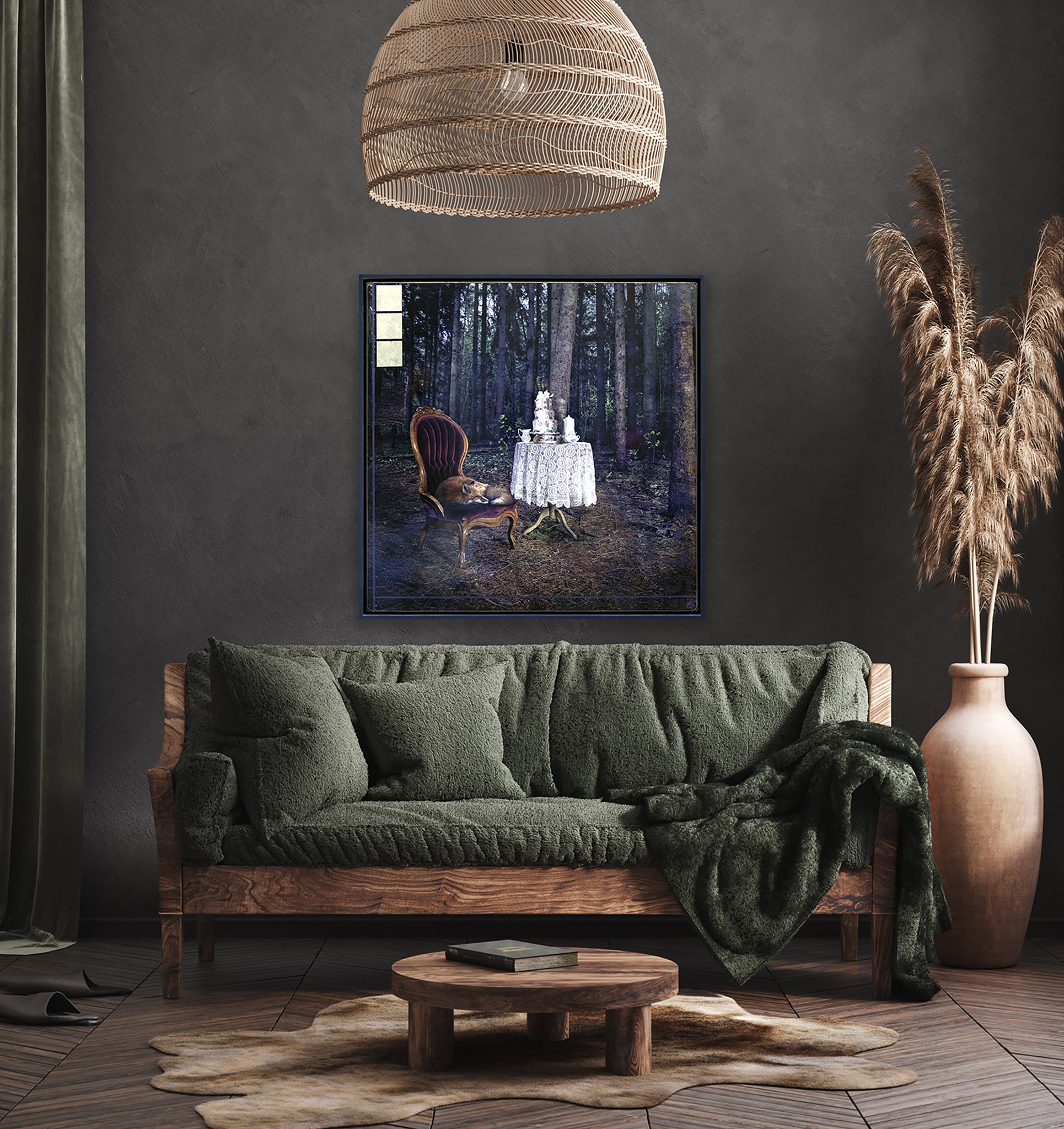 "Sweet Dreams" from the Animals Series by Morgan Jones portrays a sleeping fox curled up on a regal, red vintage chair in a peaceful forest setting. Beside it, a table draped with lace holds an elegant tea service, creating a serene and whimsical atmosphere amidst the trees.