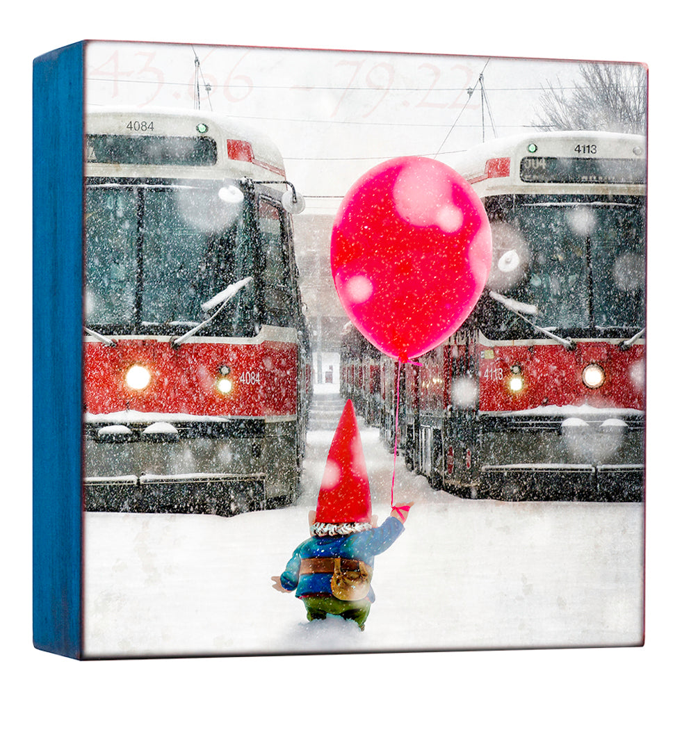 "The Commute" from the Wandering Gnomes Series captures a solitary gnome braving a snowstorm with a single red balloon. The scene is set in Toronto’s wintery east-end stockyards where a row of Toronto Transit Commission (TTC) streetcars stands in waiting, their lights a warm contrast to the cool snow.