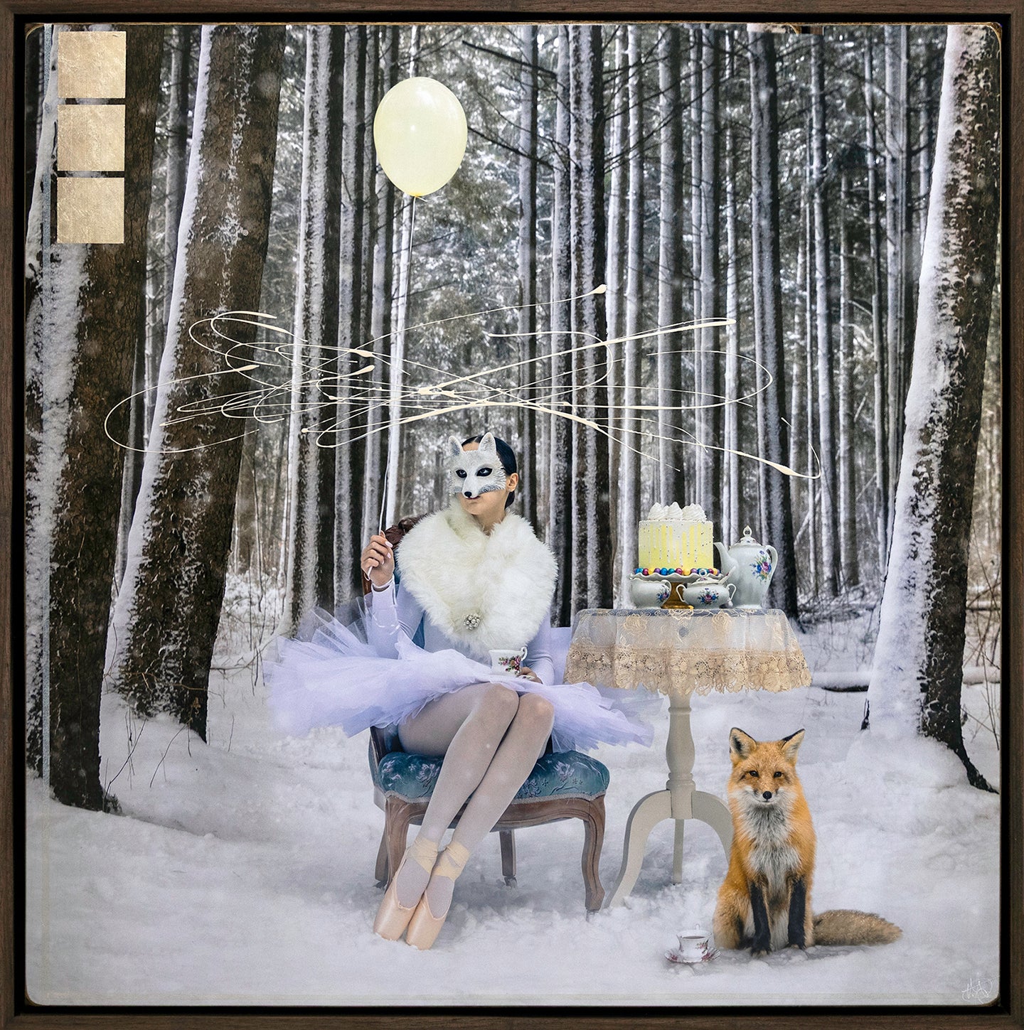 "The Companion" from Morgan Jones's Masked Series features a ballerina wearing a white fox mask and white tutu, sitting in an elegant chair amidst a winter wonderland beside a tea setting with cake. A red fox sits in the snow beside her keeping watch. This piece is whimsical and surreal.