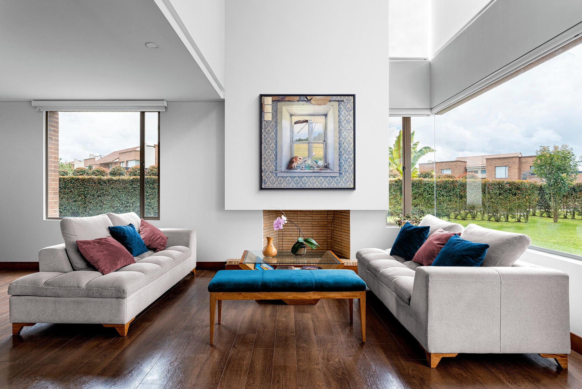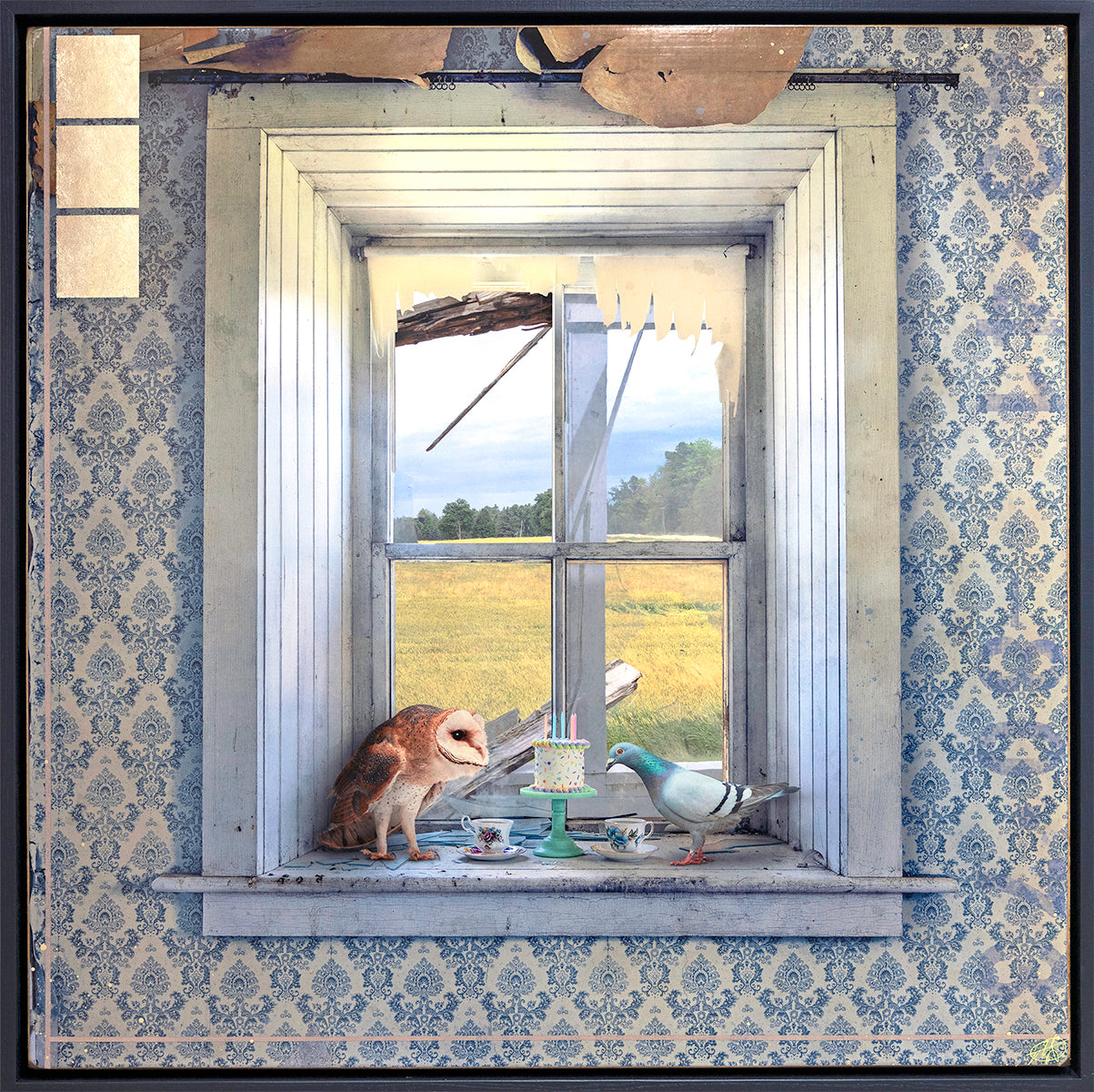 "The Conspiracy" is part of Morgan Jones's Animals collection, featuring a barn owl on a dilapidated windowsill looking intently at a single pigeon as they look at each other across an afternoon tea setting. The view through the window reveals serene summer farmland, all encapsulated by the rustic charm of the window's worn frame.