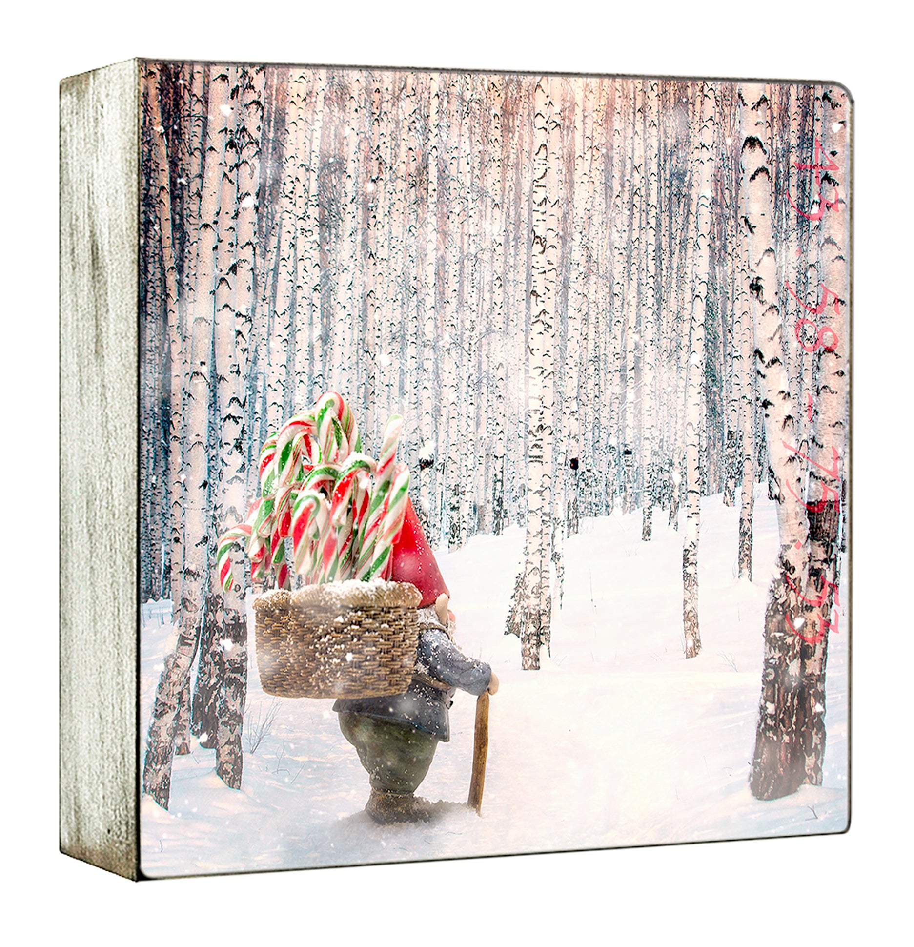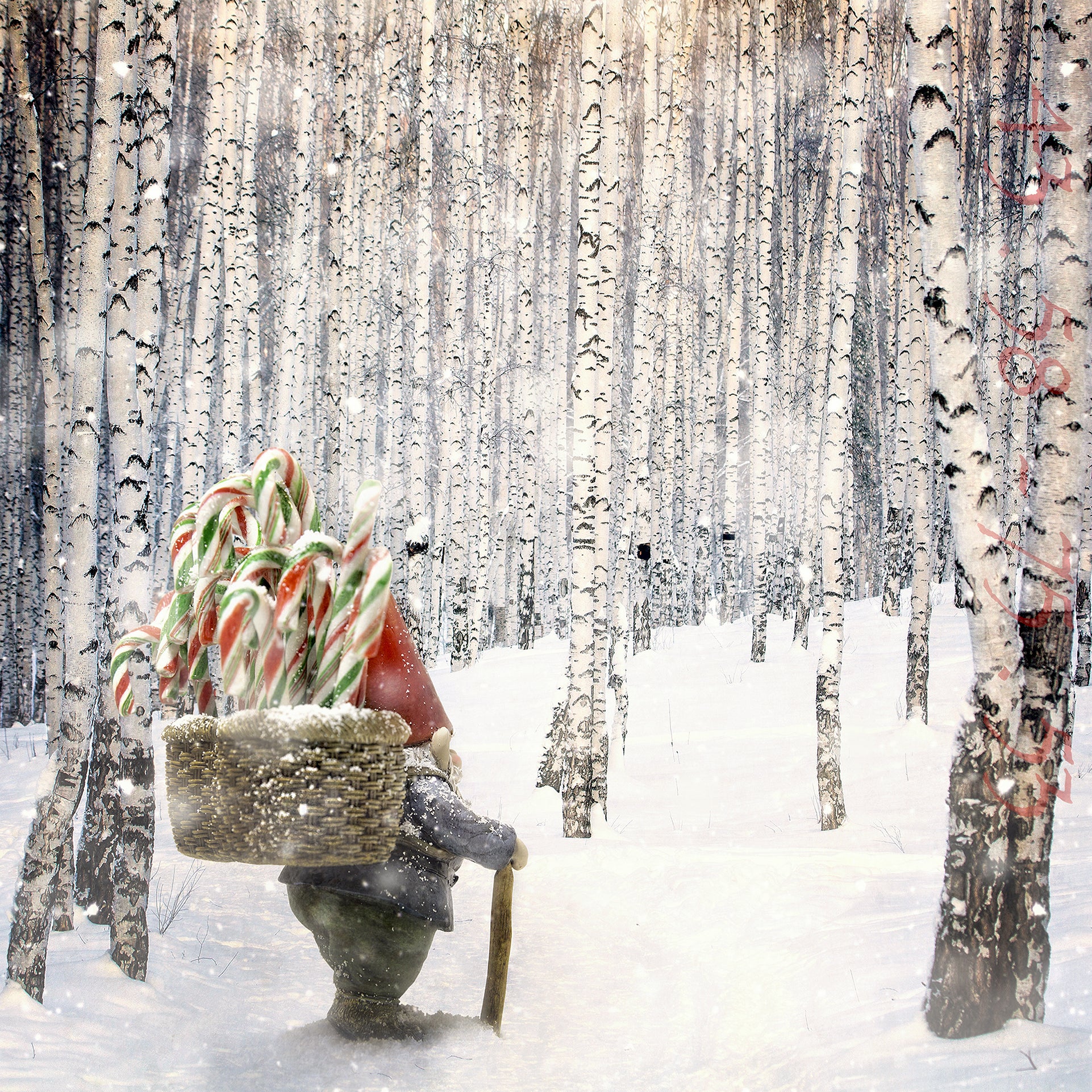"The Delivery" from the Wandering Gnomes Series depicts a gnome with a red hat and blue coat, walking with a wooden stick and carrying a wicker basket full of candy canes, traversing a snowy path lined with birch trees.