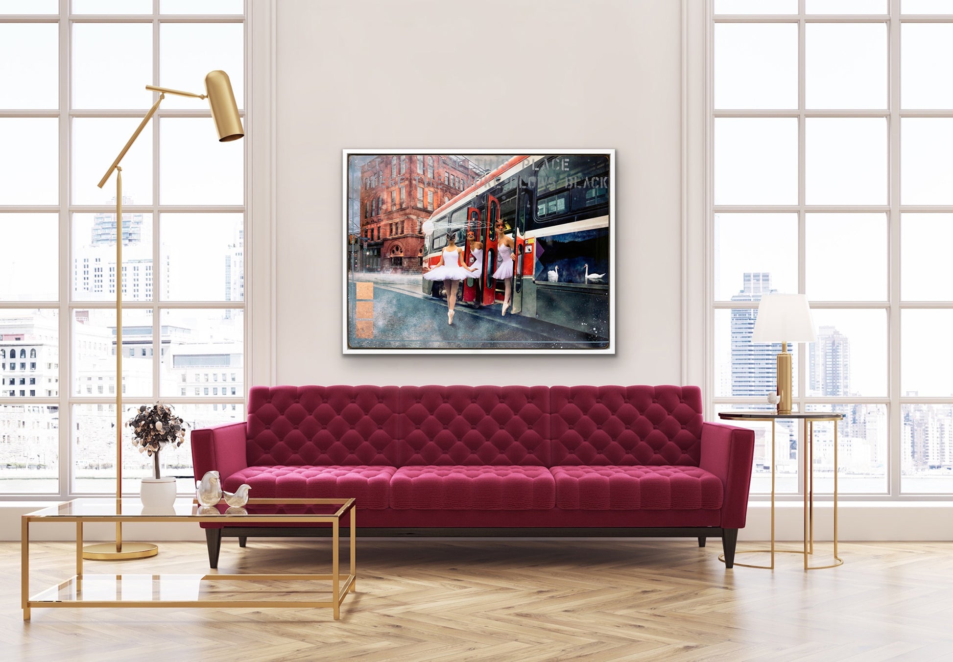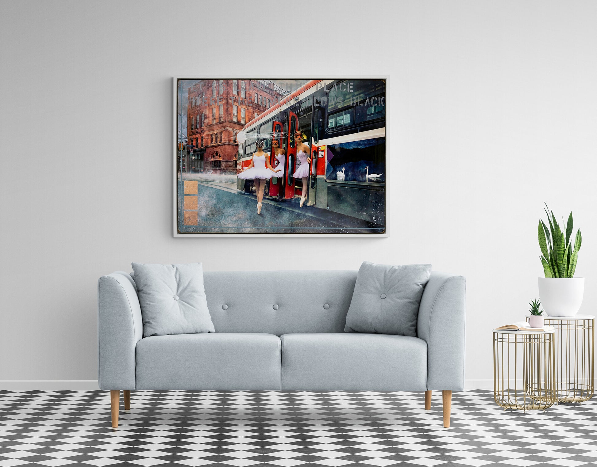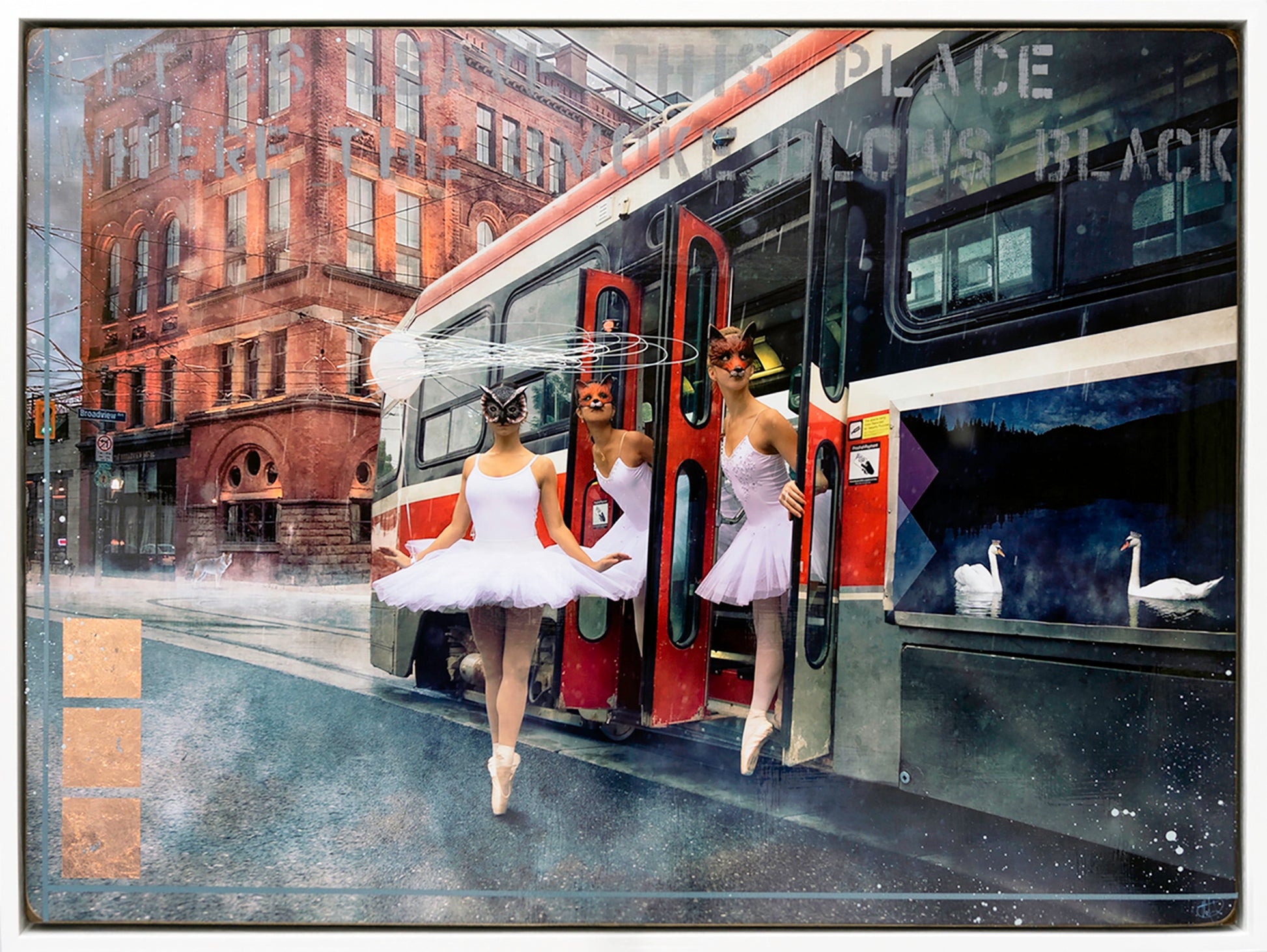 "The Great Escape" a captivating visual from Morgan Jones's Masked Series, presents three ballerinas with owl and fox masks—one on the city street and two exiting a Toronto Transit Commission (TTC) streetcar. Above them, a series of swirls embellish the air, adding a layer of movement to the composition set against the Broadview Hotel in Leslieville.