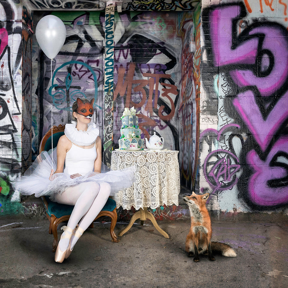 "The Invitation" from Morgan Jones's Masked Series features a ballerina wearing a fox mask and white tutu, sitting in an elegant chair beside a tea setting and cake in an alleyway tagged with graffiti.  Thew word "love" is visibly evident. Above floats a balloon while intricate swirls arc above her head. There is a curious fox sitting by the ballerinas side and staring up at her.