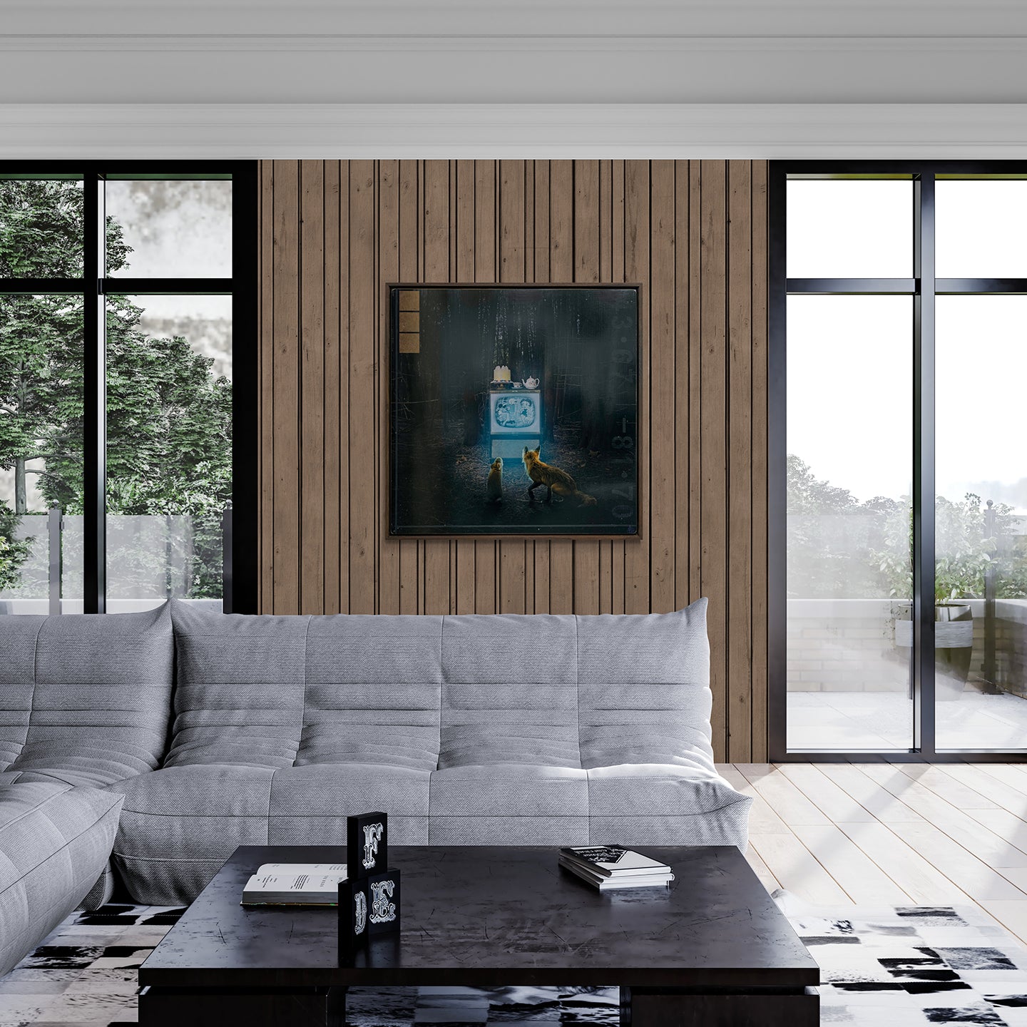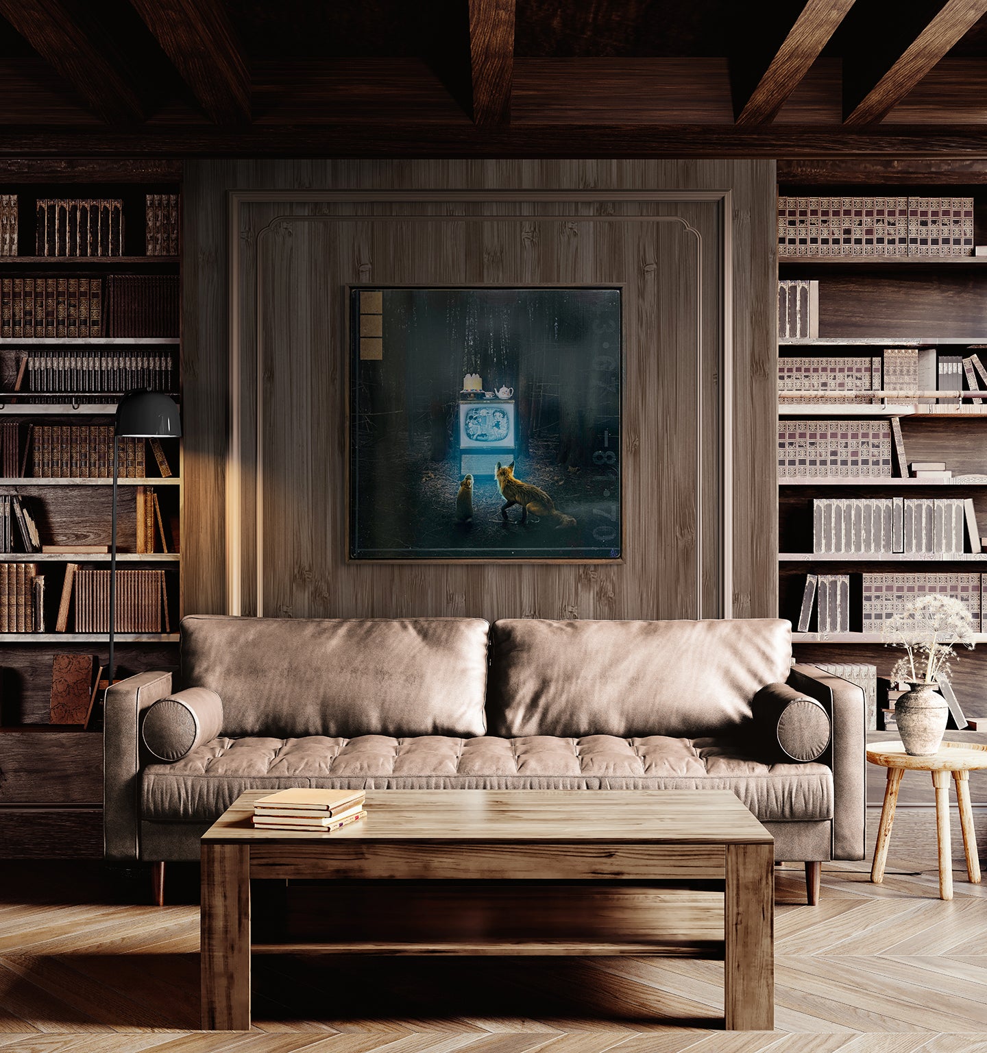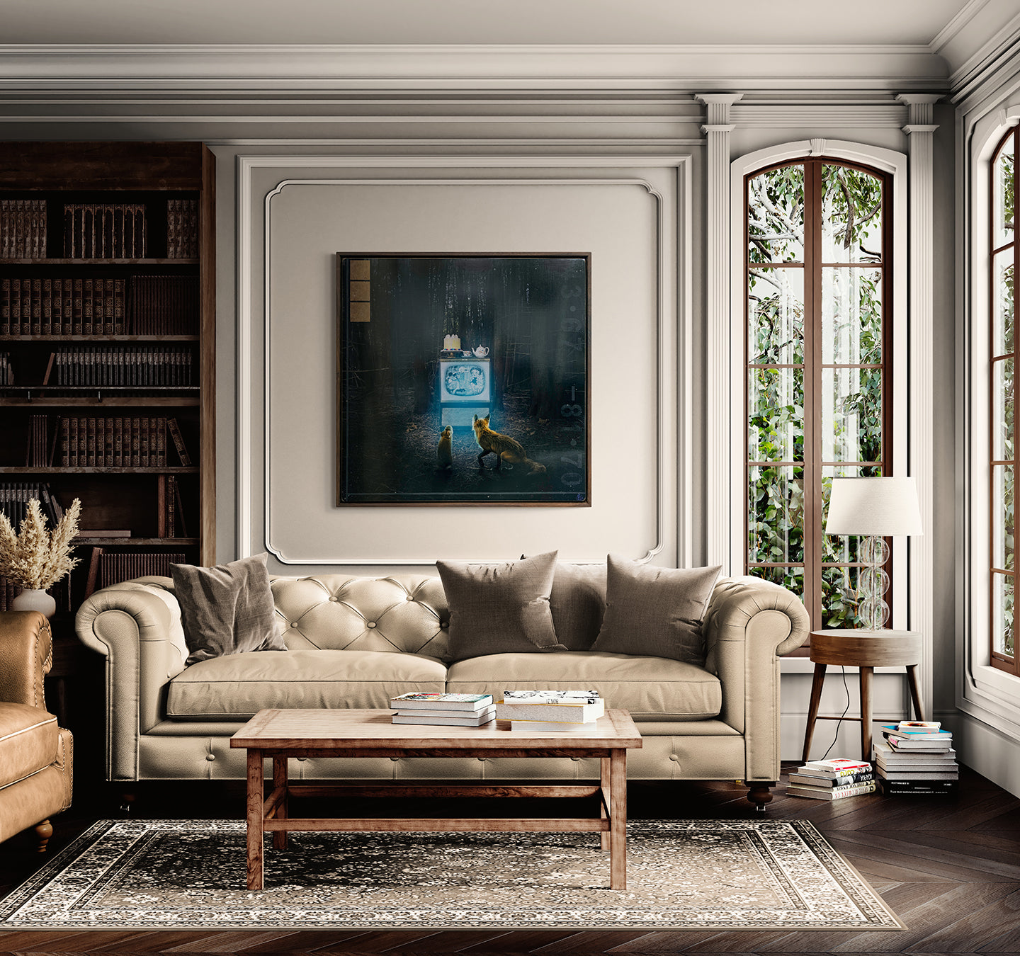 "The Looking Glass" from the Animals Series by Morgan Jones depicts a moody, darkened wooded clearing where a Fox and a Rabbit have stumbled upon an old episode of Betty Boop playing on a vintage TV mysteriously placed in the middle of the woods. The soft, bluish glow of the TV illuminates the unlikely pair as they sit captivated. Set on top of the TV is a cake and tea setting.
