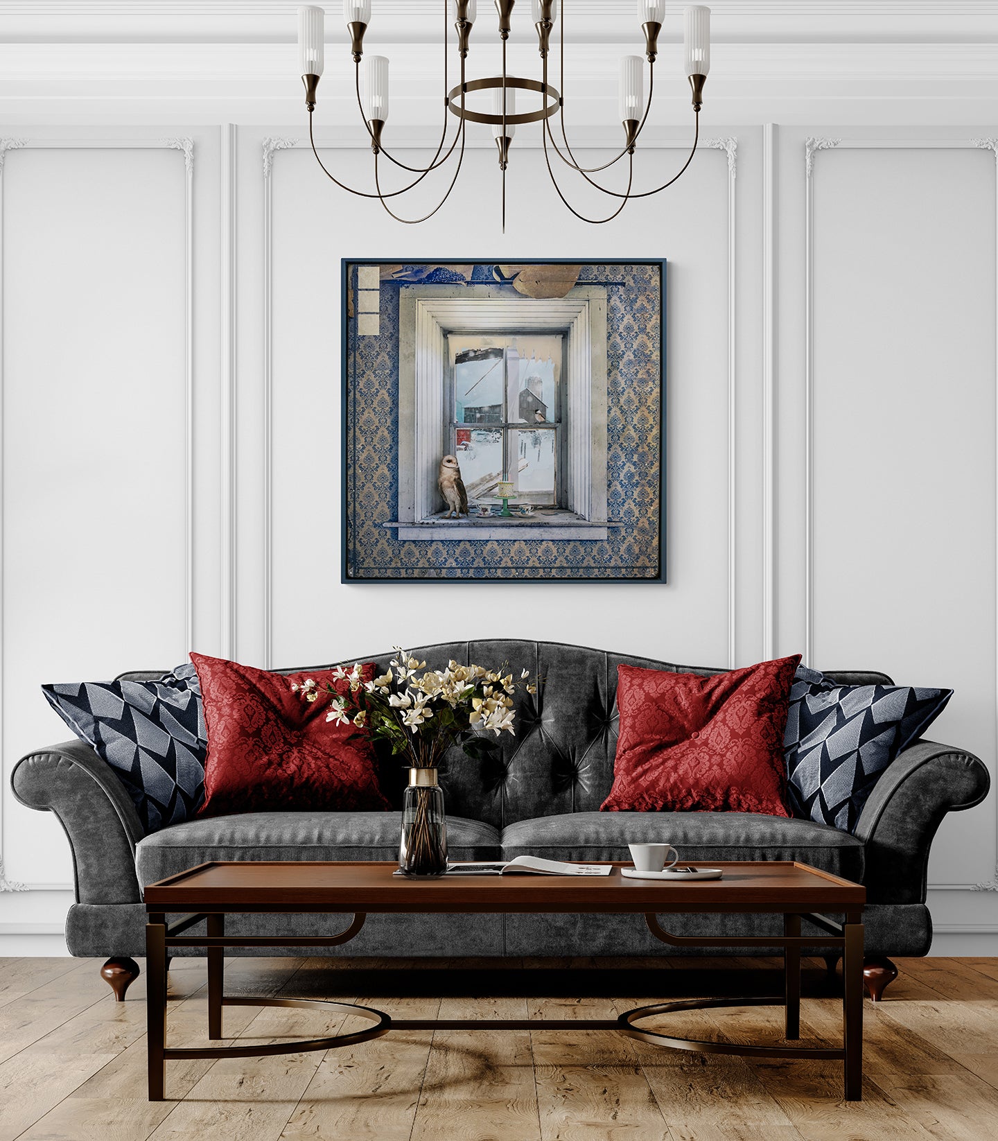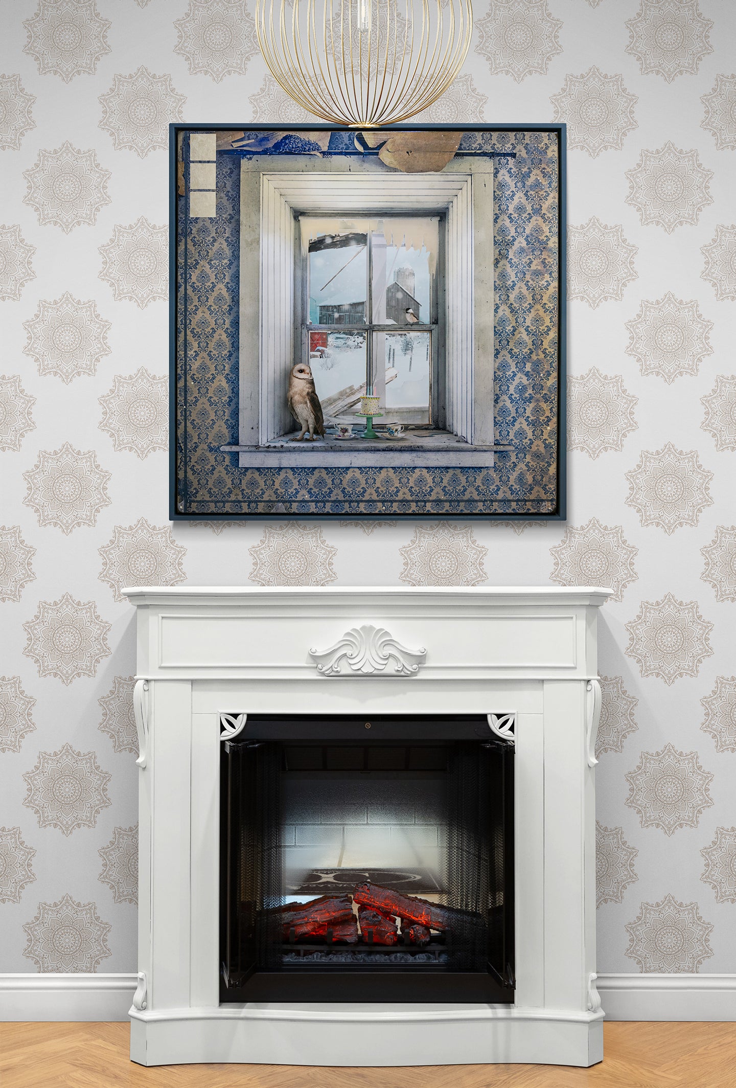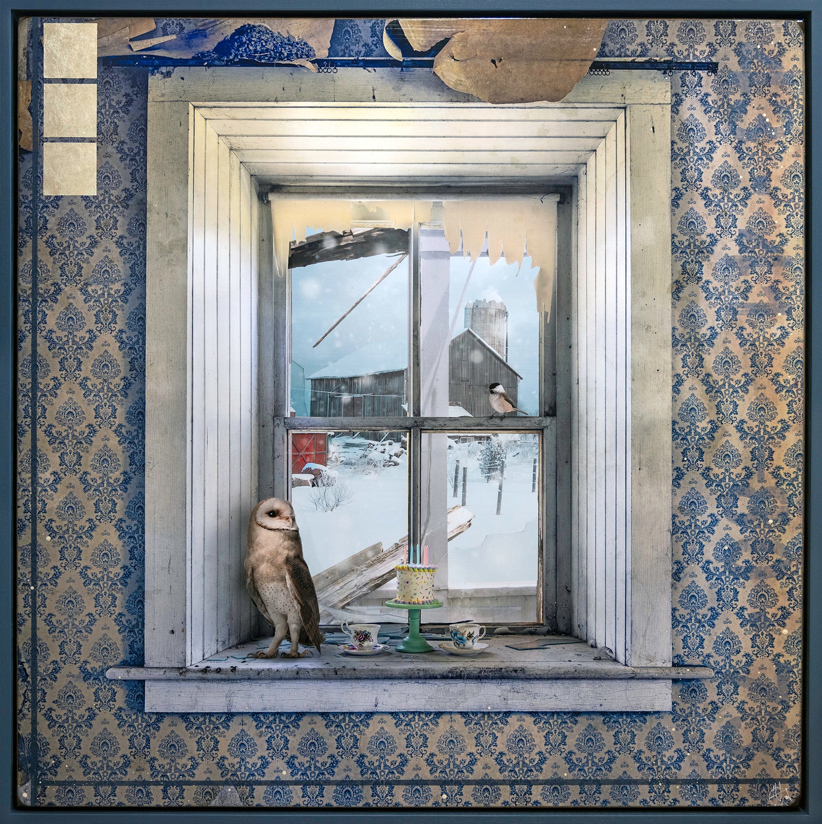 "The Reprieve" from the Animals Series by Morgan Jones depicts a wintery afternoon in which an owl and chickadee take shelter over a cup of hot tea. They are sheltering in an abandoned farmhouse on an old delapitated window ledge. In the background is a snow covered barn.