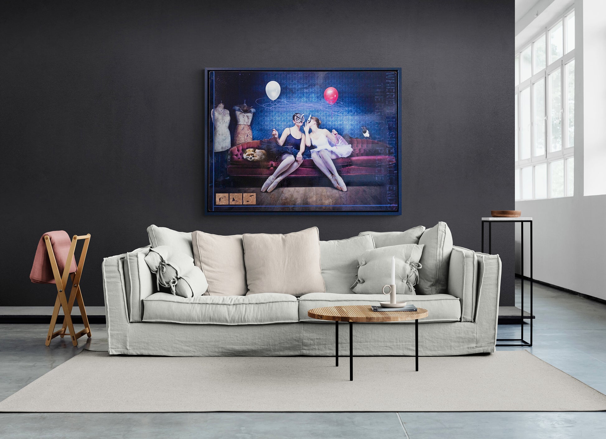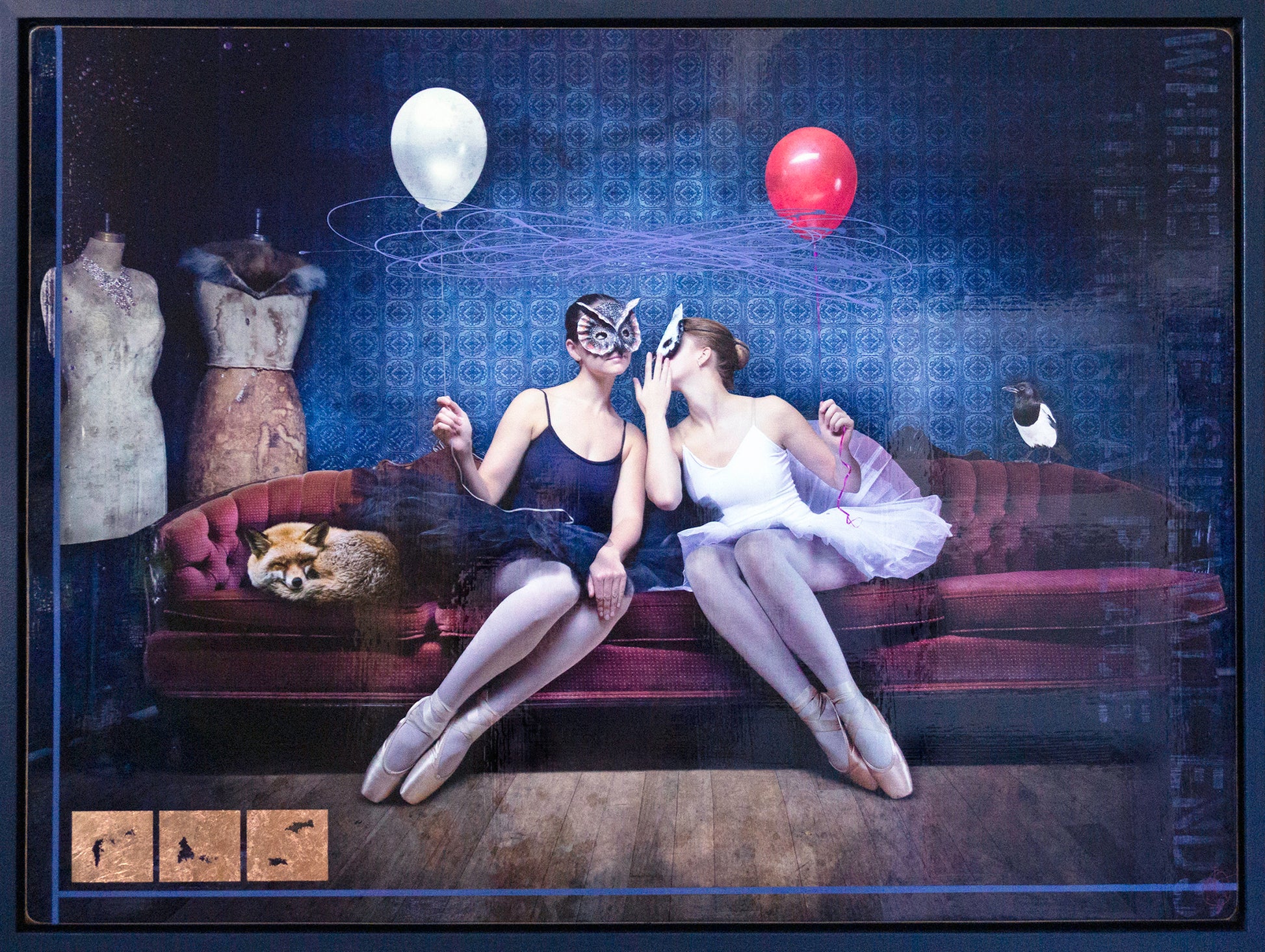 "The Secret" is a mixed-media piece from Morgan Jones's Masked Series, featuring two ballerinas in masks seated on a vintage sofa—one in black, the other in white—engaged in a private moment. A fox rests beside them, and two balloons, one white and one red, float above with swirls echoing the whispered exchange. A magpie perches atop the couch, completing the scene, rich with hidden narratives.