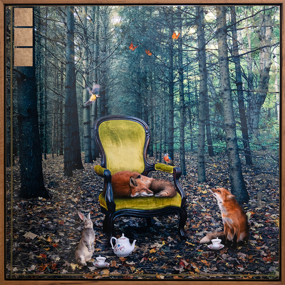 "The Secret Hour" from the Animals Series by Morgan Jones depicts a whimsical afternoon gathering in a forest glade. A fox naps on a regal chartreuse chair, while a rabbit and curious fox await their tea. Song birds and monarch butterflies passing by decider to join in the fun as sunlight streams through the forest canopy.