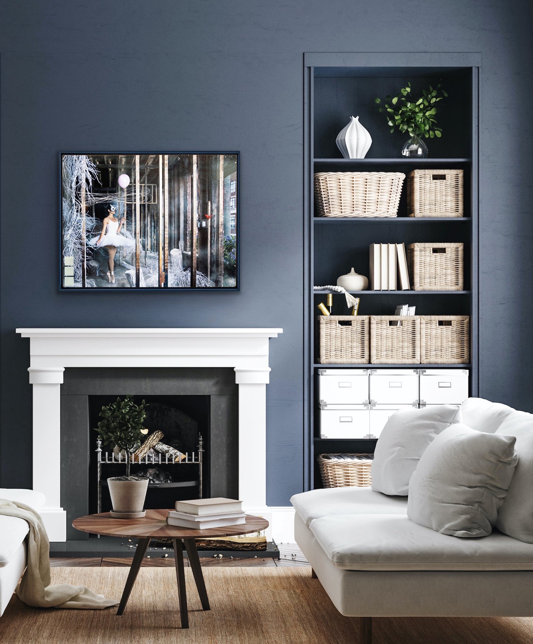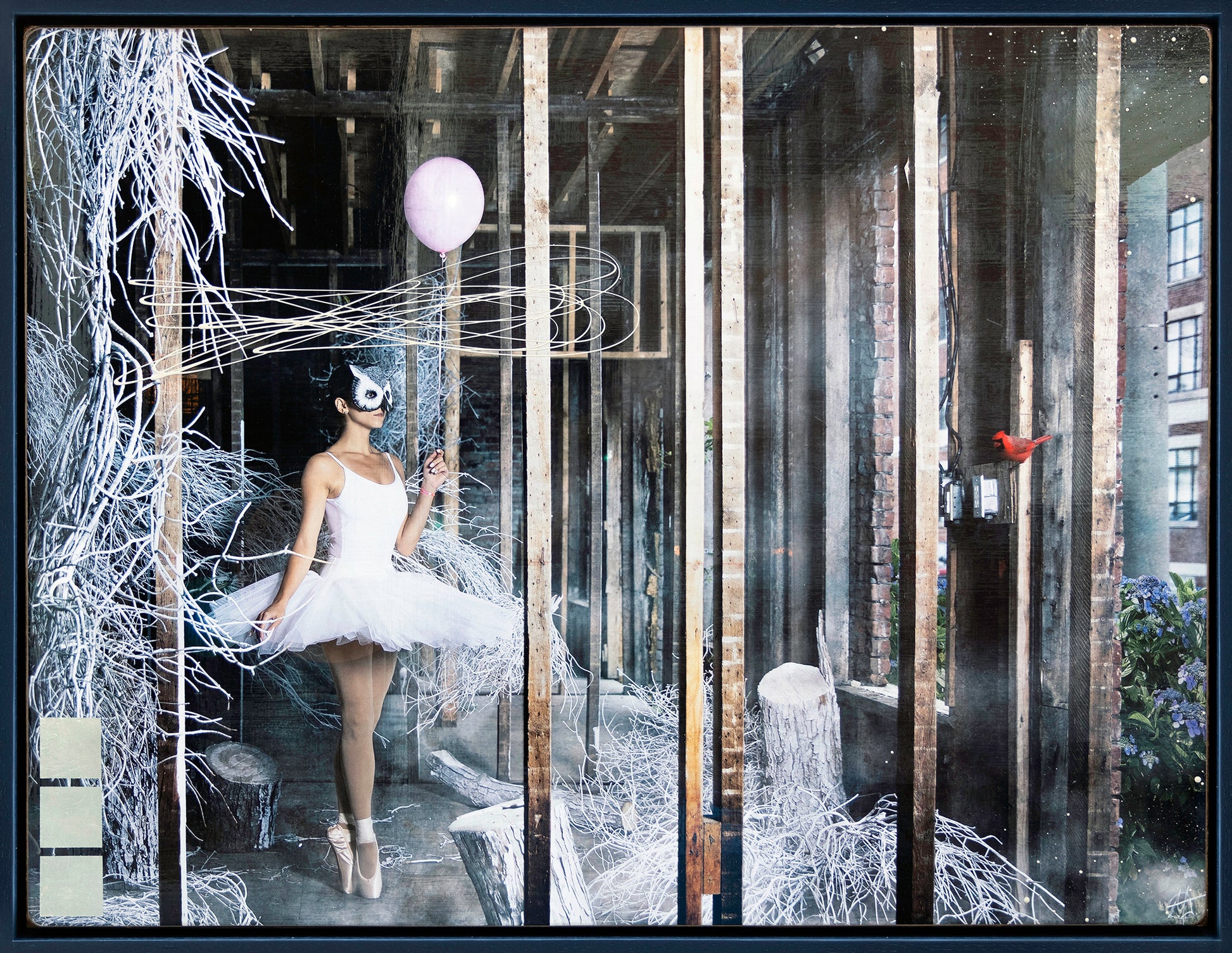 "The Visitor" from Morgan Jones's Masked Series depicts a ballerina wearing an owl mask standing in a room with exposed beams and brickwork. She holds a pink balloon, and a cardinal is visible within the abandoned space, accented by a tangle of white branches around them.