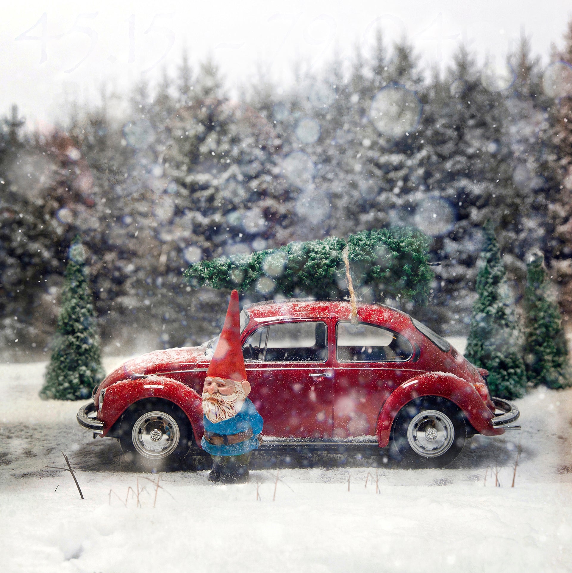 "Traditions," part of the Wandering Gnomes Series, showcases a gnome standing next to a classic red Volkswagen adorned with a freshly cut Christmas tree. The scene captures the essence of holiday preparations, with snow gently falling around the evergreen trees in the background, adding to the festive atmosphere.