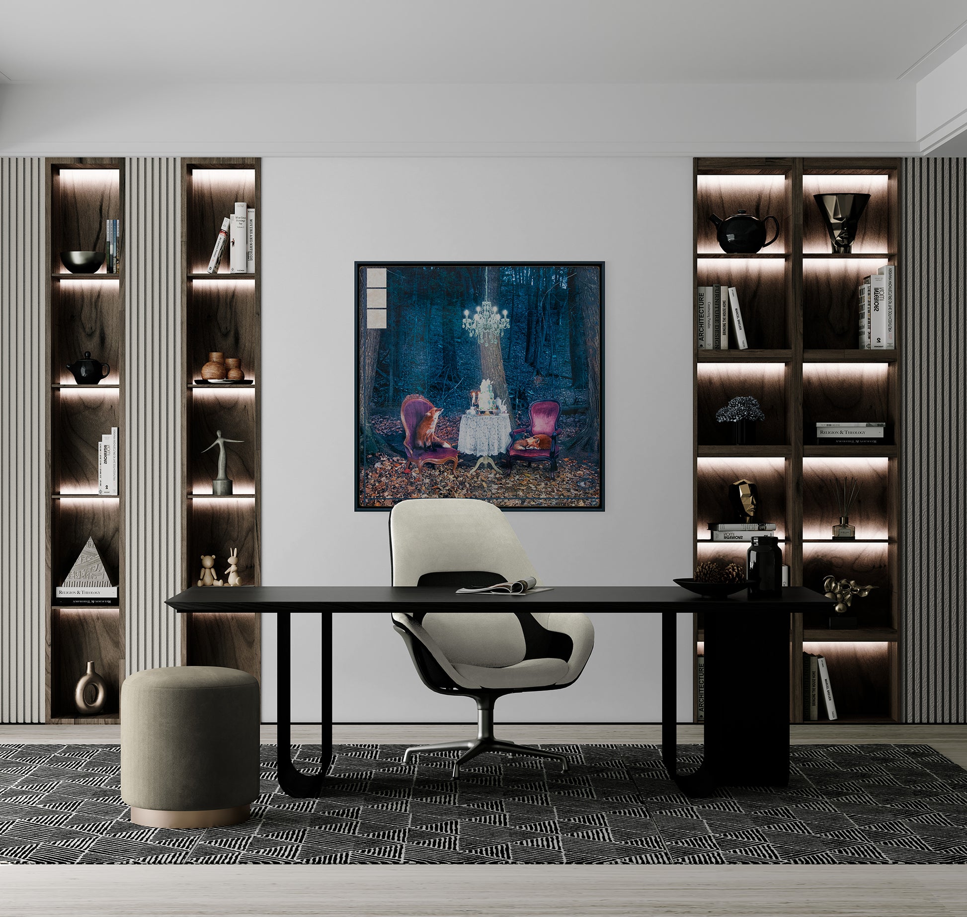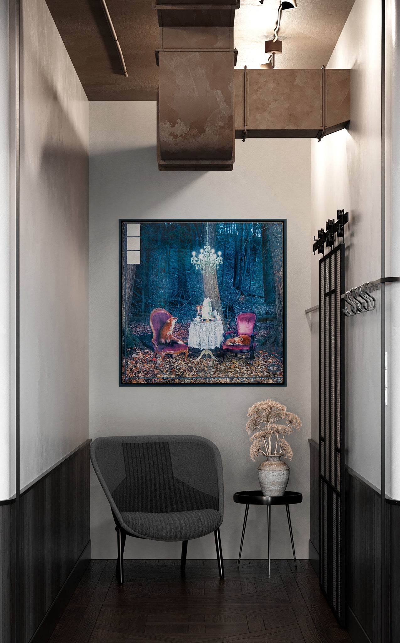 "Twilight Jubilee," from Morgan Jones's Animals series, depicts a whimsical forest scene at dusk where two foxes partake in a tea party. One fox sits attentively on a vintage red chair, while the other rests comfortably on a similar chair across a table adorned with a lace tablecloth and tea set under the soft glow of a chandelier hanging from a tree.