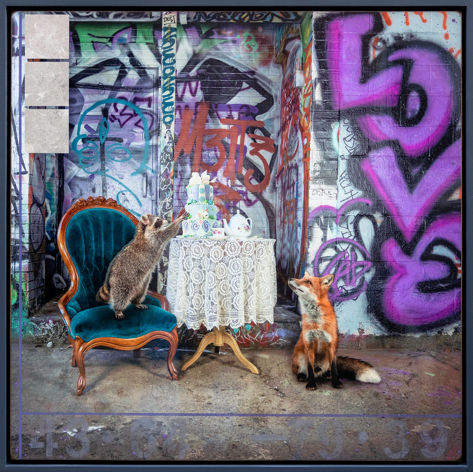 "Sweet Tooth" from the Animals Series by Morgan Jones showcases a raccoon on a vintage chair and a fox, both captivated by a colourful cake on a table set for afternoon tea against a wall covered in vibrant graffiti. The word “Love” in graffiti is featured prominently on the right-hand side. This piece juxtaposes urban street art with the curious, natural behaviour of the animals.