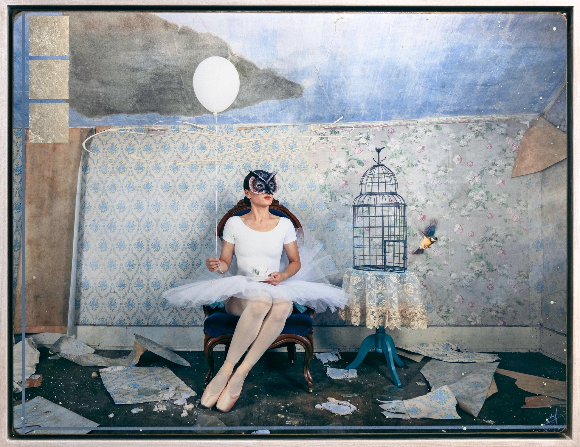 "Winged Wishes" from the Masked Series by Morgan Jones features a ballerina in a white tutu and owl mask seated in an old, weathered room in an abandoned farmhouse. A songbird escapes an open birdcage while a blue balloon floats nearby, and intricate swirls fill the space above her.