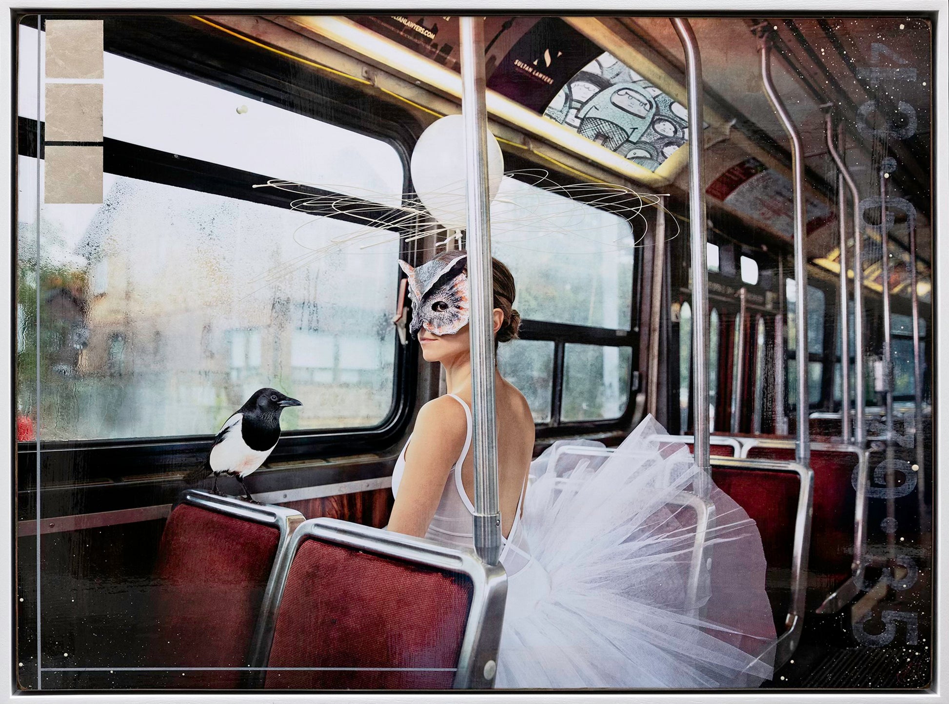 "Wistful Thinking" from the Masked Series by Morgan Jones features a ballerina in an owl mask seated on a Toronto Transit Commission (TTC) streetcar, with a magpie companion perched nearby. Swirls above hint at the ballerina's contemplative mood, while the streetcar's interior and rain-streaked windows set a scene of quiet introspection amidst urban chaos.